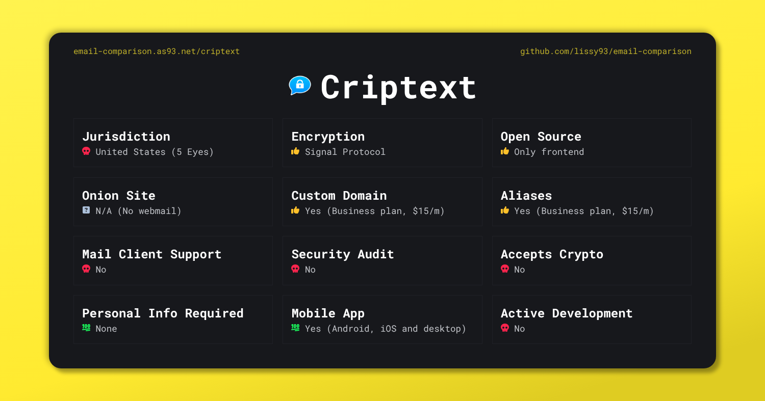 I've used Criptext on and off between 2018 and 2021. I really like the idea of properly owning your own data, and not having to rely on a mystery cloud. The data is stored on your own device, and synced between your clients. Which means you need to have the app installed in order to receive mail. There's no web client, and obviously no support for SMTP/IMAP. It uses Signal Protocol for encryption messages, which although quite cool, means you can not send encrypted messages to users using any PGP-encrypted service, without manually encrypting / decrypting. It has less quality of life features (compared to ProtonMail, Tutanota and Skiff), like advanced filters, rules, etc. Which can make it harder to use if you get a high volume of emails, as you can't use an external mail client. But the main reason I no longer use Criptext is because it doesn't appear to be actively maintained anymore. It's be awesome to hear from @jorgeblacio, @danieltigse, @erikaperugachi, @Hirobreak (the core maintainers), if they're still around. |