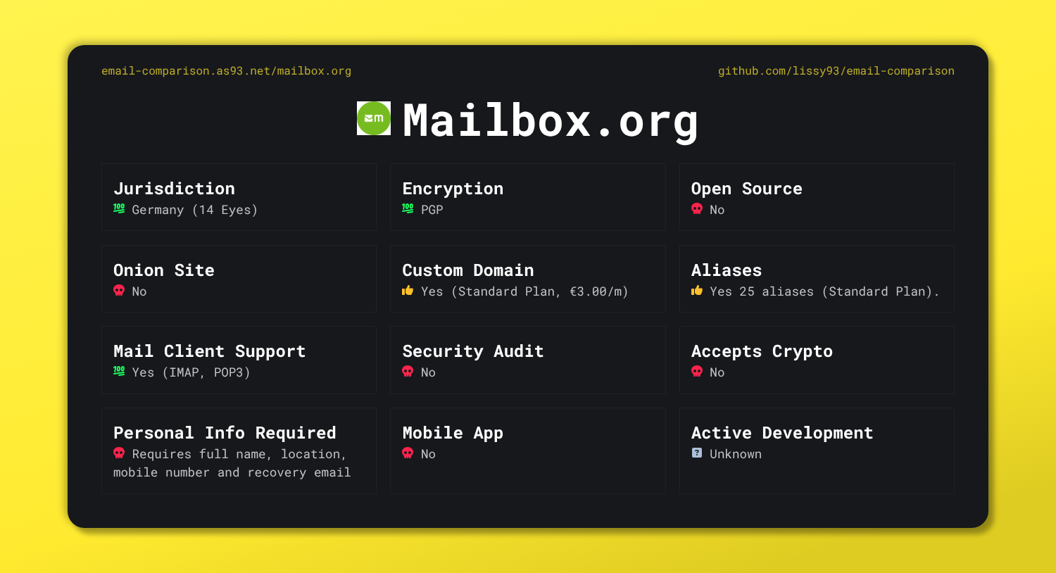 I have been using mailbox.org for at least 6 years now, and I am still totally happy. This is, in my opinion, one of the best mail providers within Germany. Like always, you need to understand that privacy is something you will pay for - that's why this service isn't free. With a paid account, you can use your own domain or even create wildcard (catch-all) email addresses. If you don't like this, you can still go with an alias (which enables you to send from this alias as well). For a few months, not only PGP but S/MIME is integrated into the web mailer as well; even with bring-your-own-key. For people who likes to register to different services without providing "valid" addresses, you can go with temporary created addresses which you can delete if you don't need them anymore. All in all, this one is my favorite provider and the support is fast, friendly and helpful as well. Oh, and everything works fine on iOS as well; even with push. |