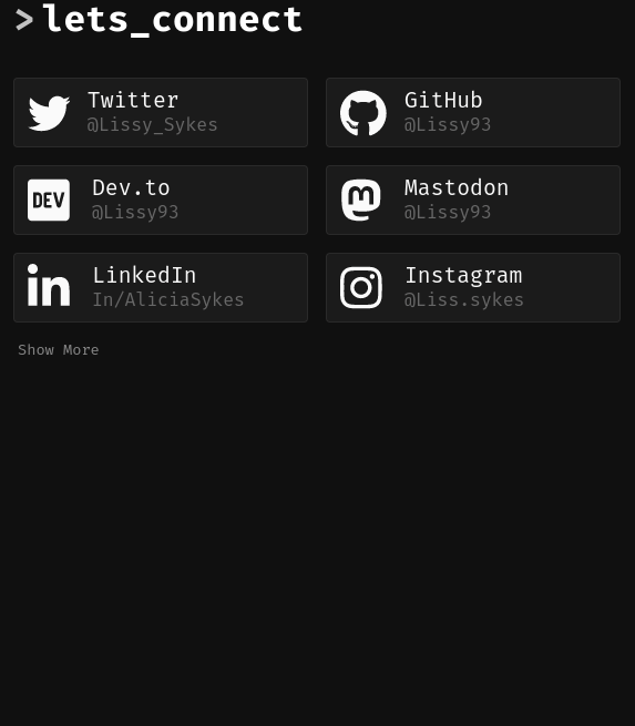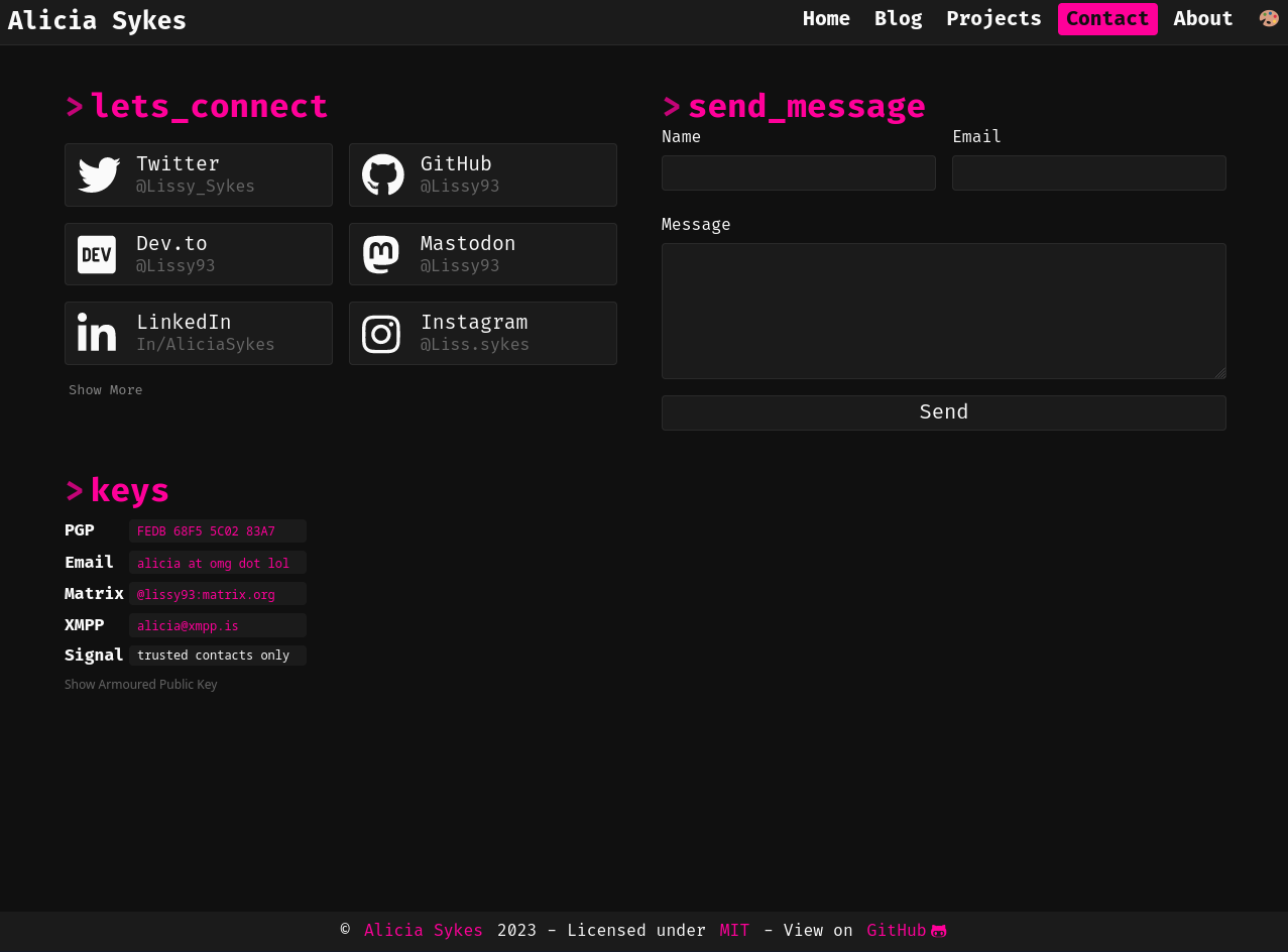 The contact page includes links to social profiles, a contact form, and space for GPG keys. Hover over the social media links, to show relevant user stats, like follower count, karma/ rep, join date and more. The contact form let's users write you a message, and include their name + mail address. Upon sending, the message will be emailed to you, using EmailJS. There's also space for including PGP key, and links to encrypted messenger apps.