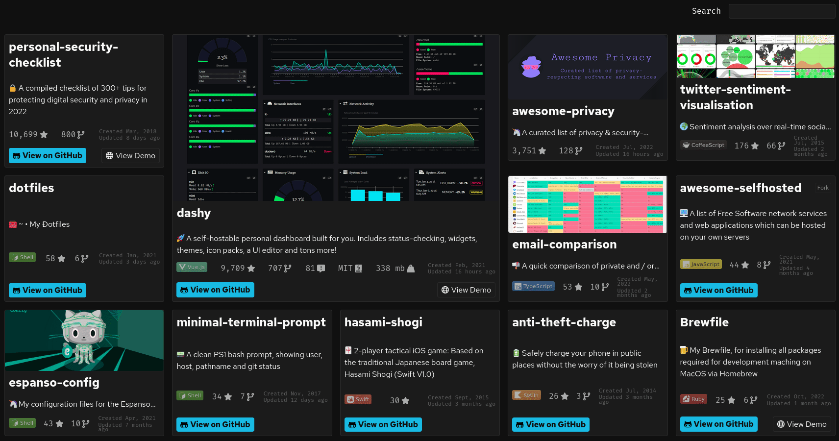 Each project can include: name, description, thumbnail, language, star/fork/issue count, license, size, date create/updated and links to the repo and project website. Featured projects can be made to span multiple cells, in order to display more info. When a thumbnail is present, the user can hover over the card to view full details. There's sorting and filtering options, useful if you've got a few hundred projects. Data is fetched dynamically from GitHub, but you can add or override any project data in the config file, as well as manually add more projects.