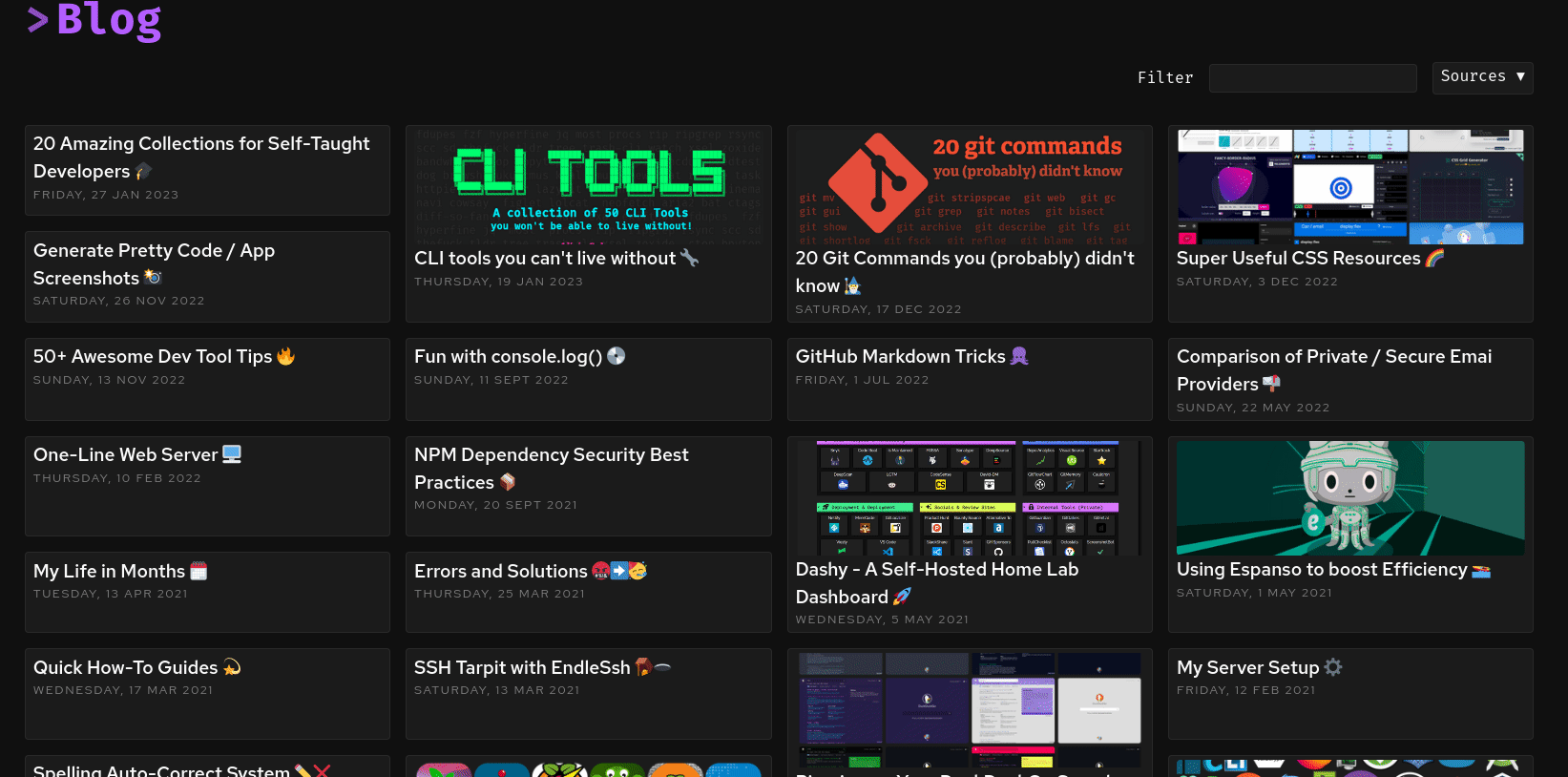 The blog page displays posts that you've published. Data is fetched and aggregated from one or more RSS feeds defined in the config. Post content is rendered as HTML, as well as metadata including author, date, link to original and optional thumbnail. The user can start typing to filter results, and use the keyboard to navigate posts.