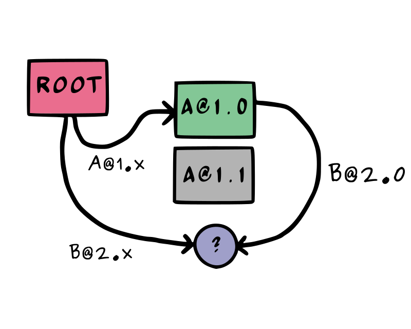 In this example, the resolver will select a version that results in a failure. When this happens, we need to backtrack and try a different path.