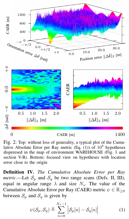 $10e \cdot \text{area} \cdot N_s$ microseconds, where$\text{area}$ is the area of the map's free space and$N_s$ is the LIDAR's number of rays. (Strictly speaking the execution time varies according to the geometry of the environment and other factors.) In the video below the environment area is$2000$ m$^2$ and localisation is performed in under four seconds -