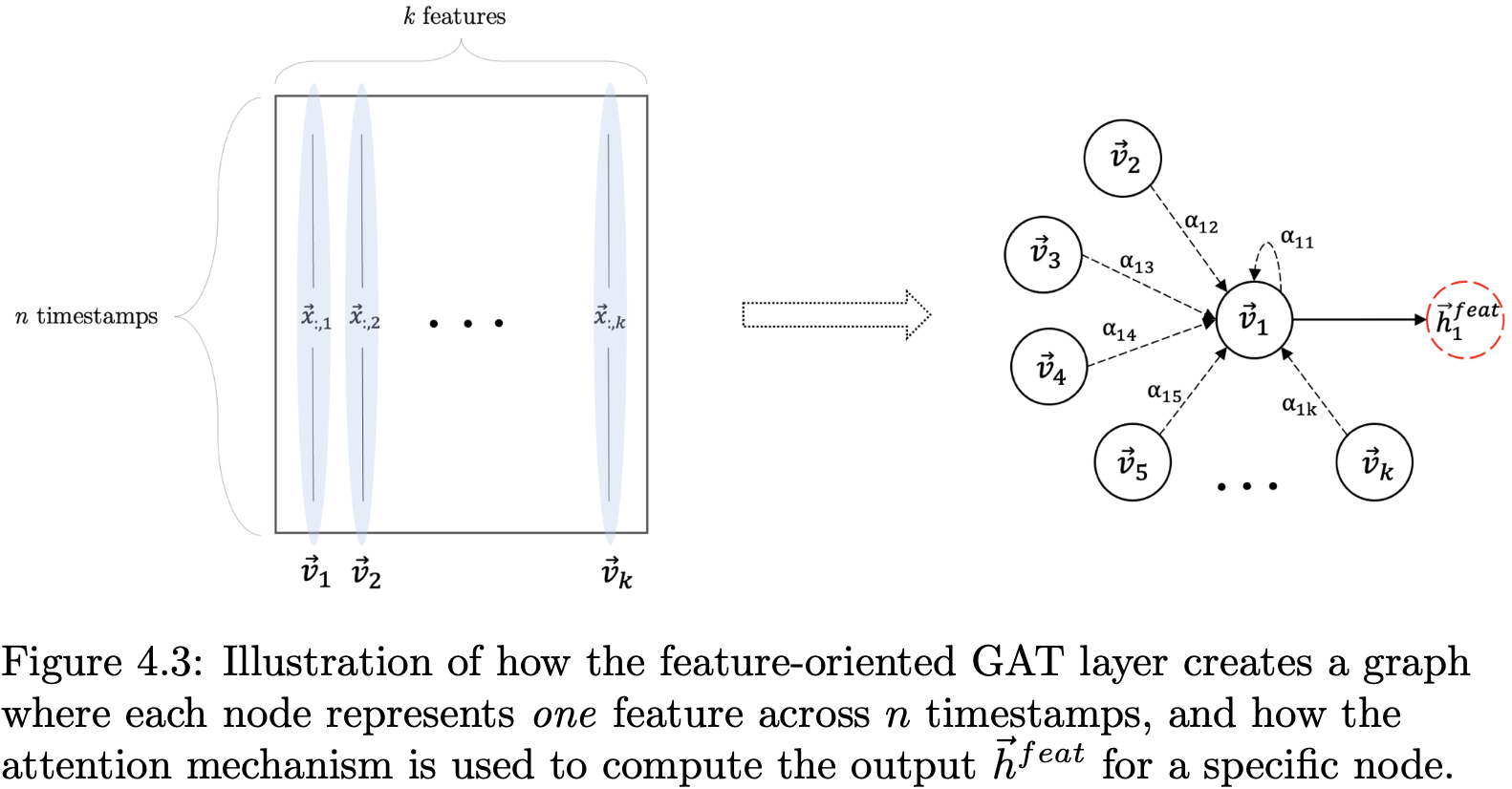 Right: The time-oriented GAT layer views the input data as a complete graph in which each node represents the values for all features at a specific timestamp.