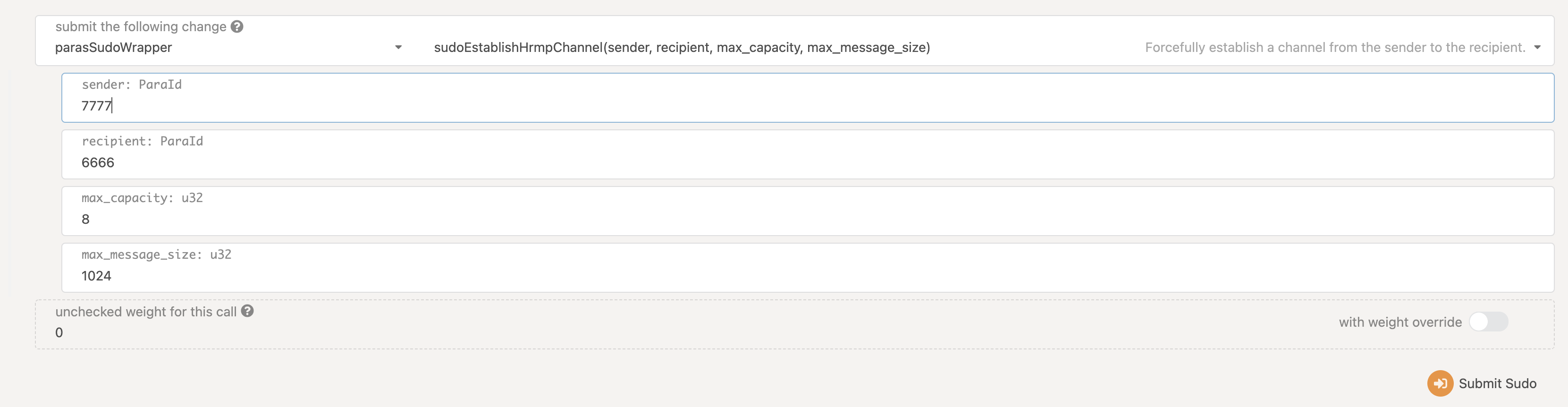 Follow both following figures to open hrmp channel under sudo permission.