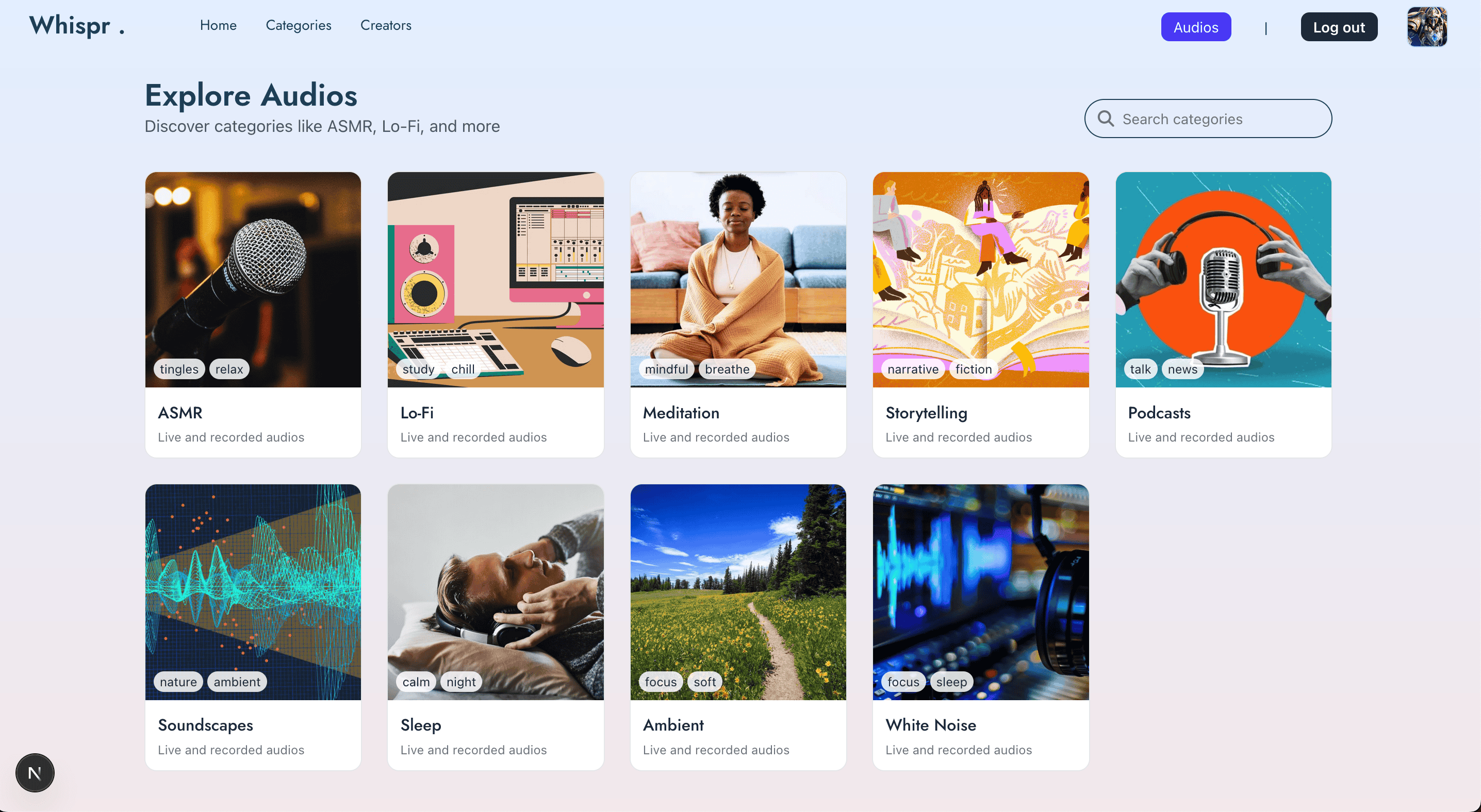 Whispr es una plataforma social enfocada en contenido de audio: permite descubrir las publicaciones más recientes, explorar artistas destacados y gestionar tu propio estudio de audio. Cada creador puede registrar una cuenta, iniciar sesión, subir pistas a la nube (vía Cloudinary), actualizar su perfil y compartirlas con la comunidad. Desde la interfaz pública los usuarios navegan por audios populares, siguen a creadores y consultan perfiles con sus listas de reproducción.