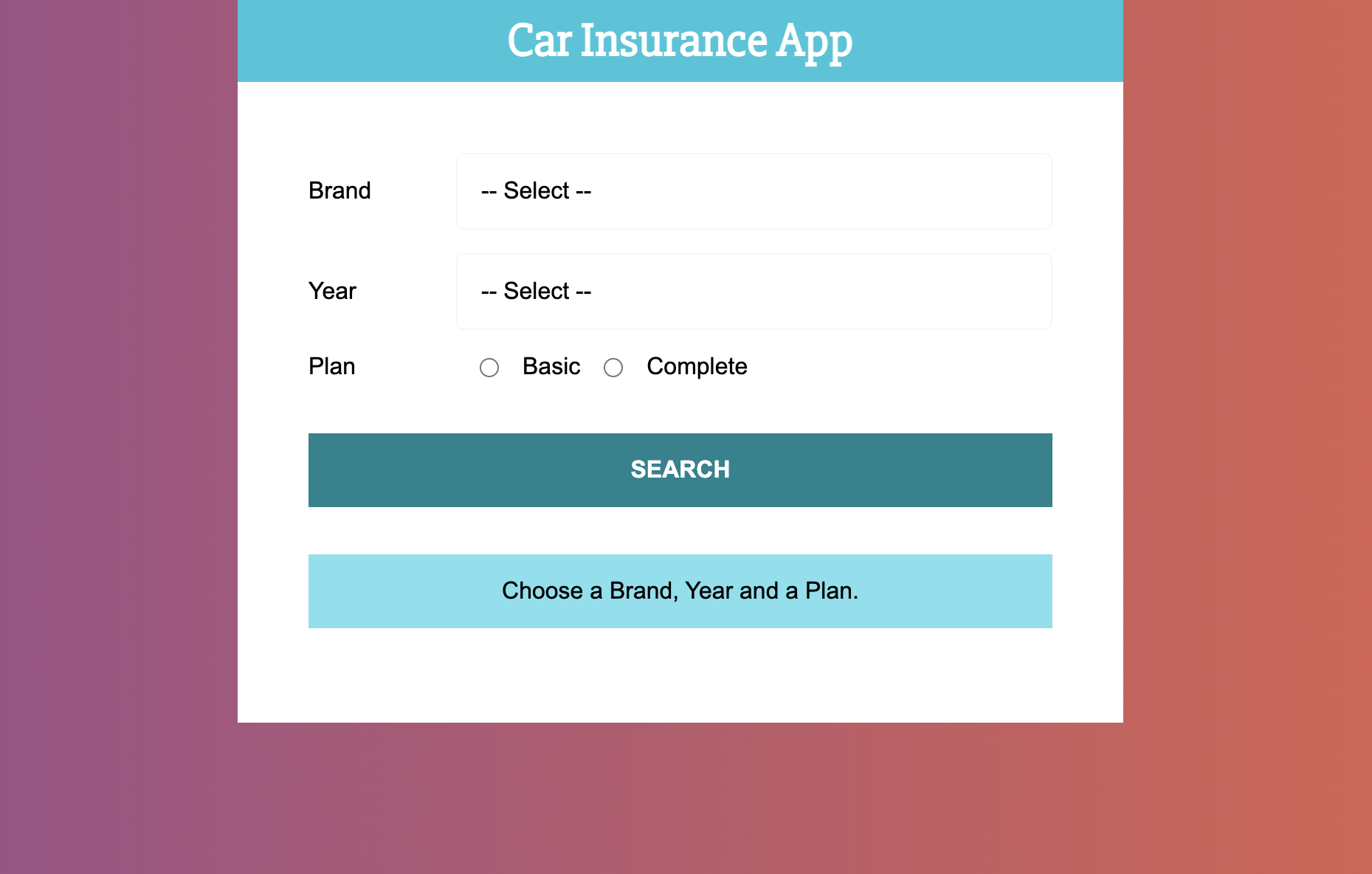 Car Insurance App es una aplicación web que permite calcular el costo de un seguro de automóvil en función de parámetros como la marca, el año y el tipo de plan seleccionado. La interfaz es interactiva: el usuario introduce los datos y recibe de inmediato una cotización personalizada, gracias a la lógica implementada con hooks de React.