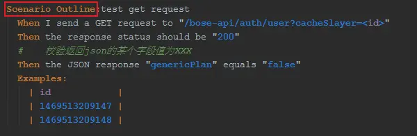 - 不涉及 Examples的Scenario,用Scenario关键字,设计到Examples 用Scenario Outline 关键字,如下: