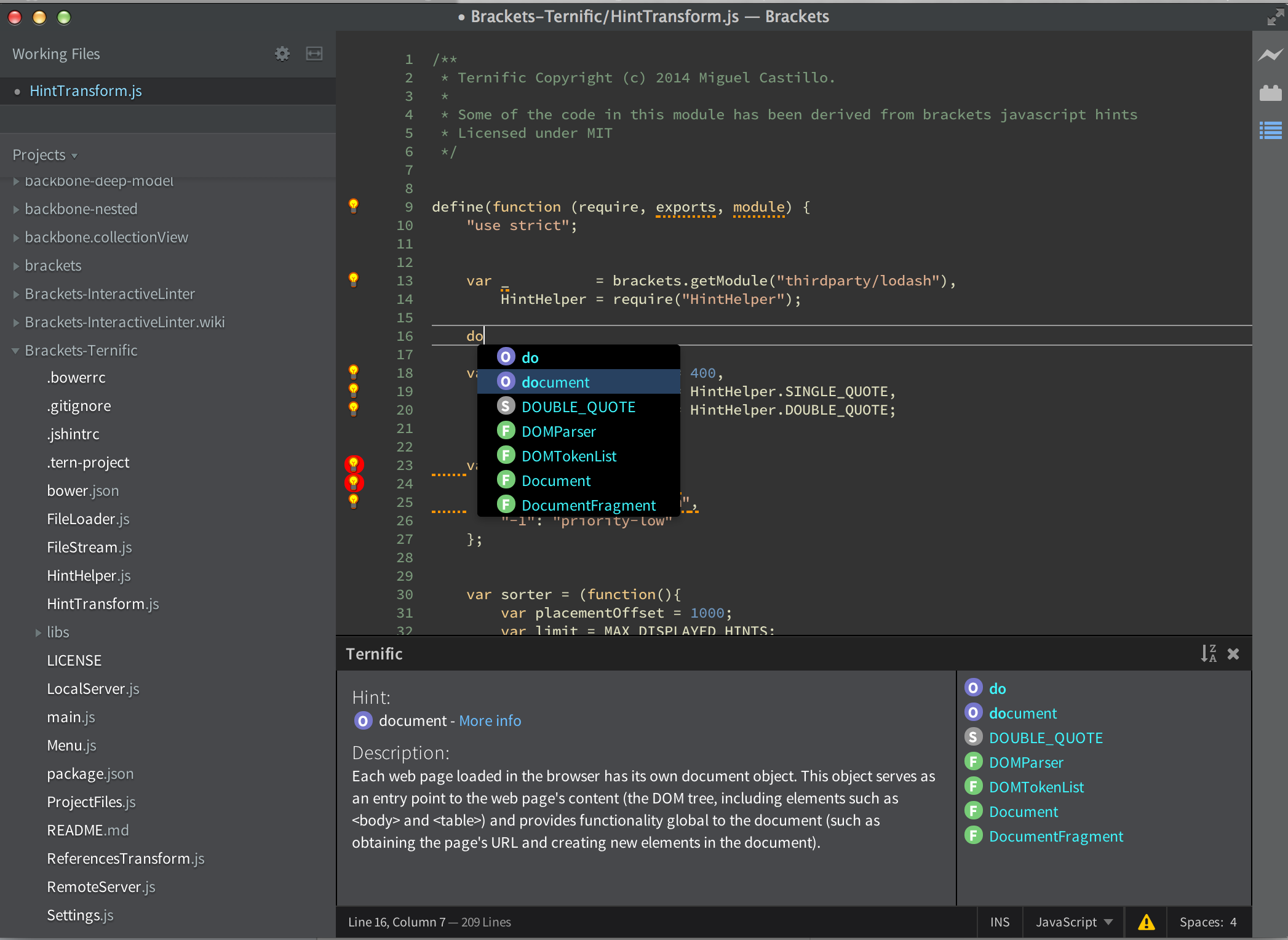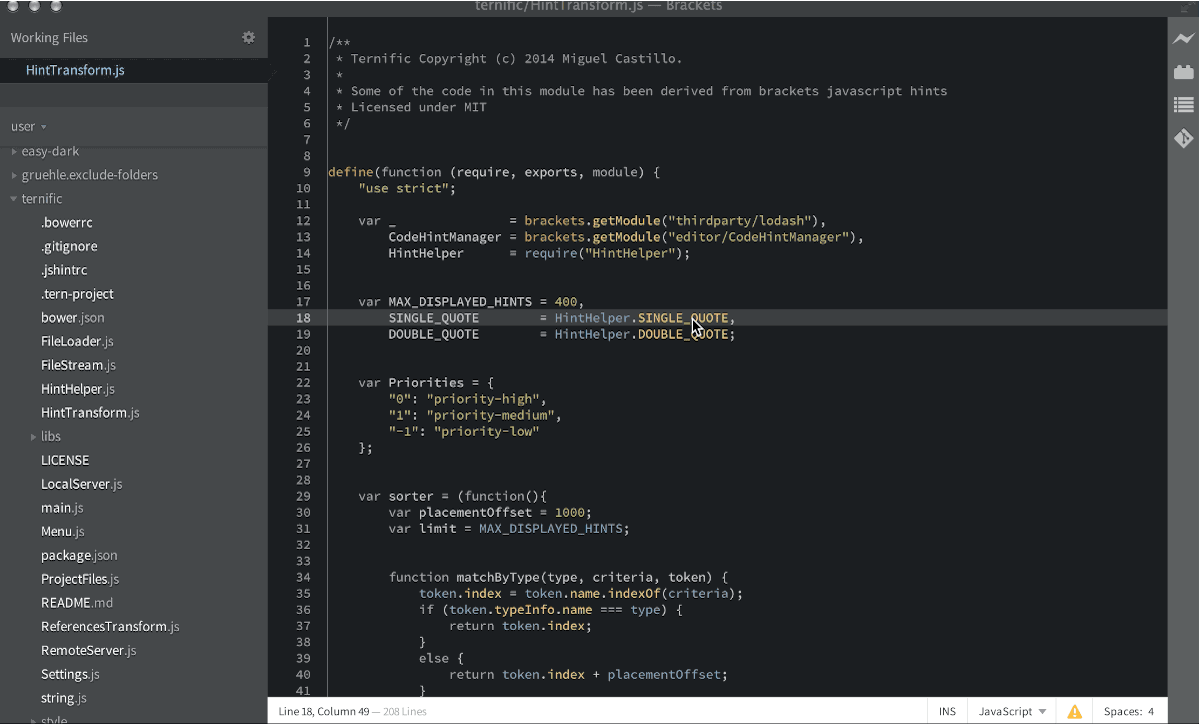 - Brackets' javascript hinting has been used and code has been lifted and integrated into this extension.