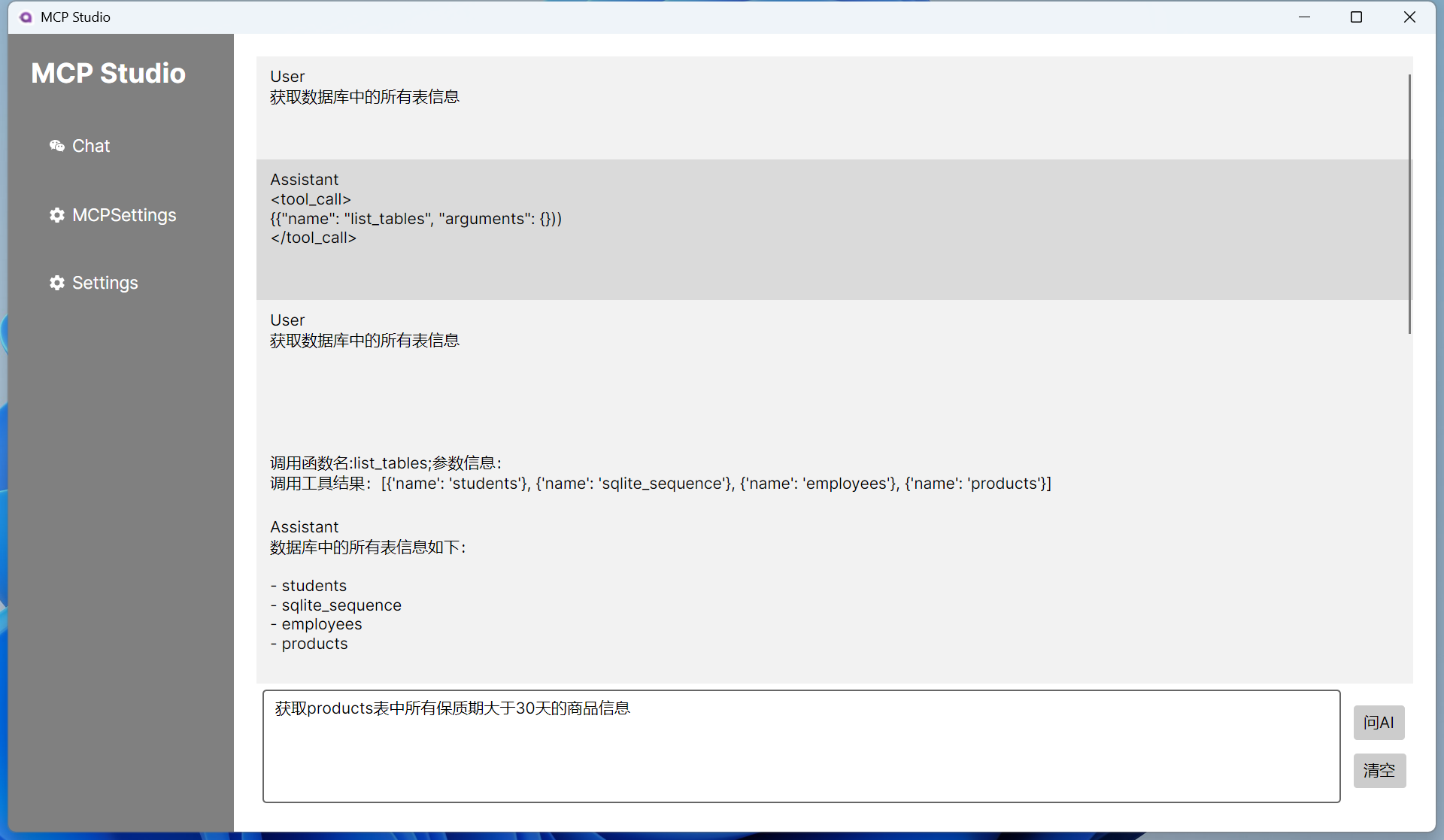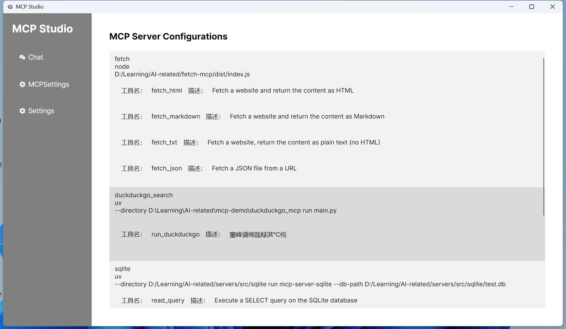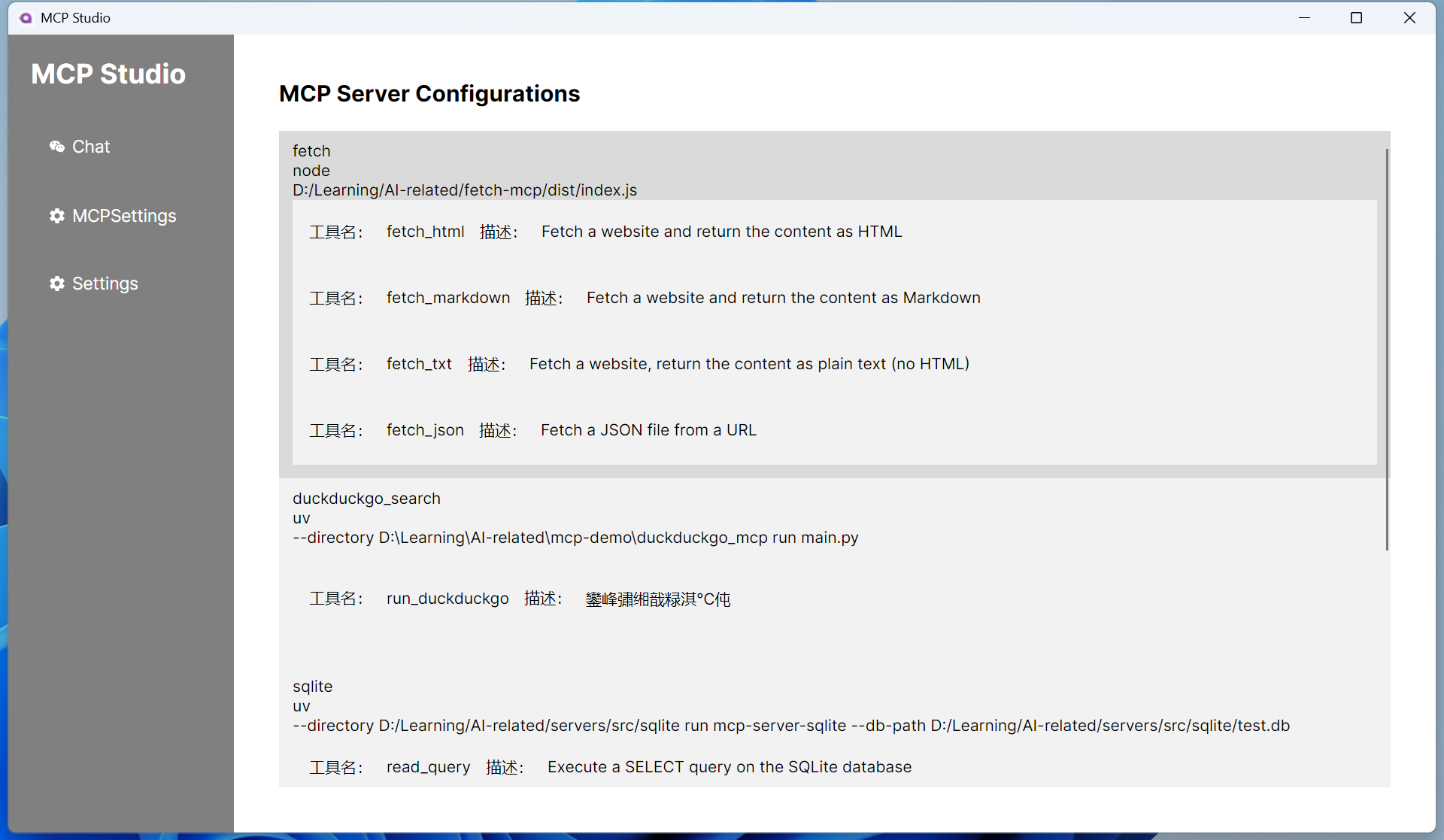 git clone https://github.com/Ming-jiayou/mcp_demo.gitEnter the mcp_demo\MCP-Studio folder, rename ChatModelSettings.json.example to ChatModelSettings.json, and fill in the large model information, for example, with Silicon Flow: