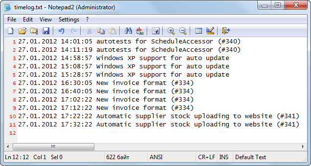 This is a tiny program to log what you do at your computer. Your activity is saved to a plain text file. Currently the program shows a popup window every 10 minutes asking for your activity. You can quickly select one from a predefined list or you can enter custom activity. You can just close the popup window and nothing will be saved to the log. You can also disallow closing the window to force you enter your activity - this adds some pressure when you are entering something like "chatting" at the time you must be working.