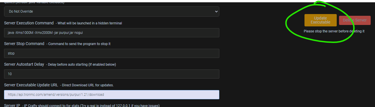 You can place https://api.tronmc.com/amend/versions/(SERVER TYPE HERE)/1.21.10/download/ into the executable URL and click Update Executable to download the latest version of the server jar.