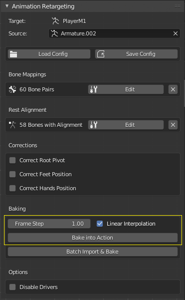 - The option "Bake Mapped Bones Only" ensures that target bones that have no retarget mapping will remain unaffected.