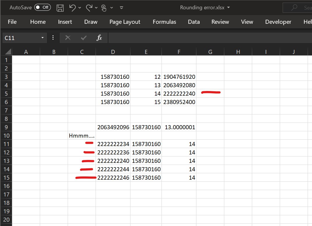 @cpaulgilman, another fun experiment in rounding... In Excel, multiply 14 by 158730160 and get 2222222240 as your correct calculator showed. Now, take 2222222236 and divide by 158730160 and get 14 in Excel (see attached workbook. |