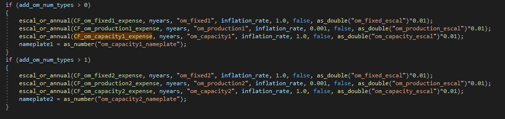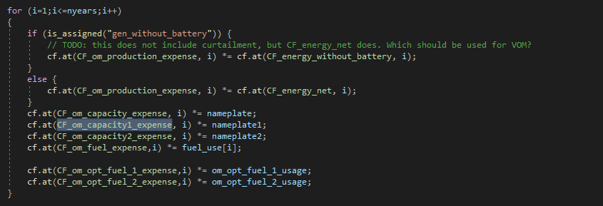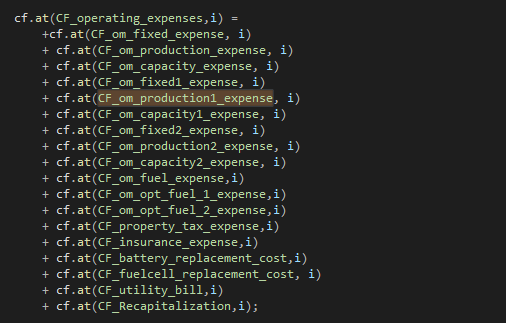 In the Fuel Cell-PV-Battery model, the variable production cost in $/kWh is input for batteries (om_production1) and fuel cell (om_production2). These values do not appear to be multiplied by the production anywhere in the financial models before being applied in the financial metric calculations. For example in cmod_singleowner.cpp: