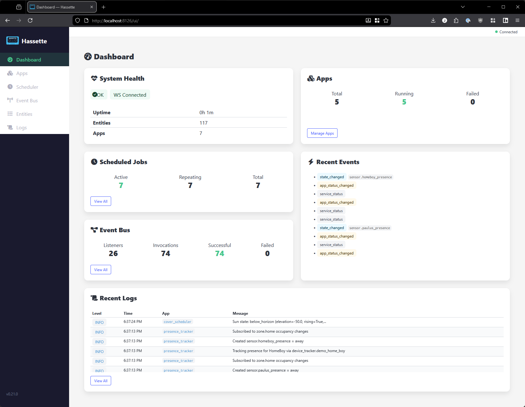 Hassette includes a dashboard for monitoring apps, viewing logs, browsing entities, and inspecting the event bus and scheduler — all in real time.
