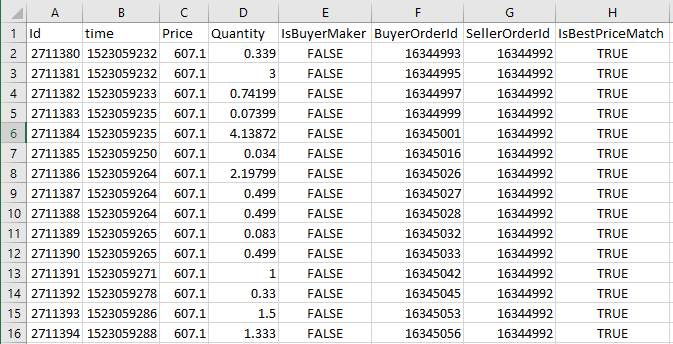 - IsBuyerMaker - was the trade completed by the buyer (true) or by the seller (false). when it is true, it means that the seller has placed a ask for his holdings and a buyer came along later on and completed the trade. when it is false, it means that the buyer has placed a bid for his curreny and a seller came along later on and completed the trade.