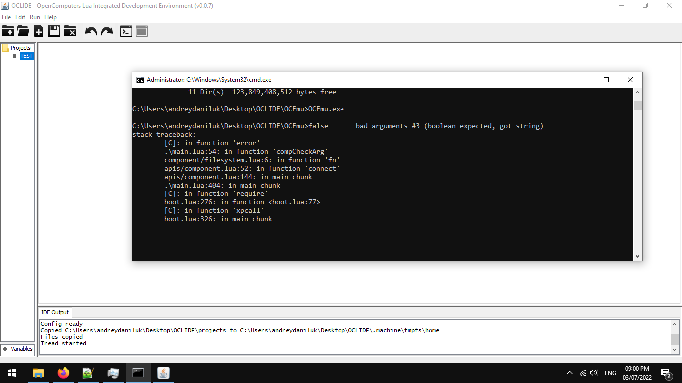C:\Users\andreydaniluk\Desktop\OCLIDE\OCEmu>false bad arguments #3 (boolean expected, got string) stack traceback: [C]: in function 'error' .\main.lua:54: in function 'compCheckArg' component/filesystem.lua:6: in function 'fn' apis/component.lua:52: in function 'connect' apis/component.lua:144: in main chunk .\main.lua:404: in main chunk [C]: in function 'require' boot.lua:276: in function <boot.lua:77> [C]: in function 'xpcall' boot.lua:326: in main chunk