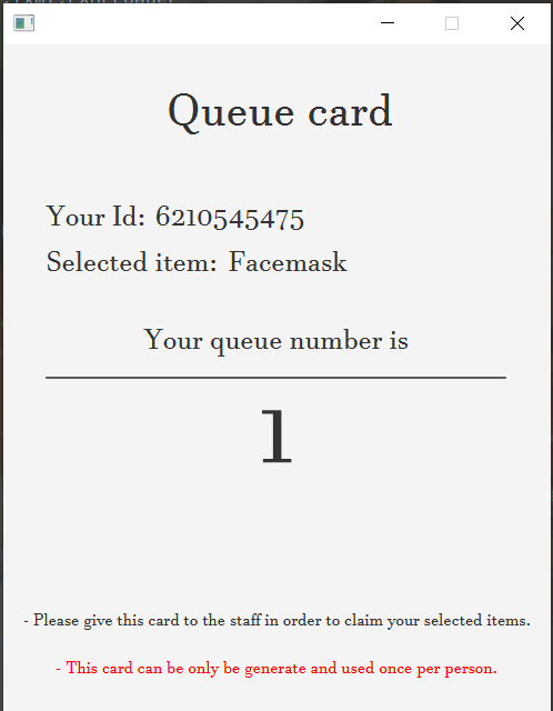 And the application will run a queue number for the user to receive the giveaway item. If someone uses the ID again, the application will decline the request, which will help solve the problem.