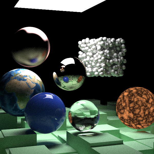 - Materials: diffuse, specular, dielectric, isotropic, and emissive