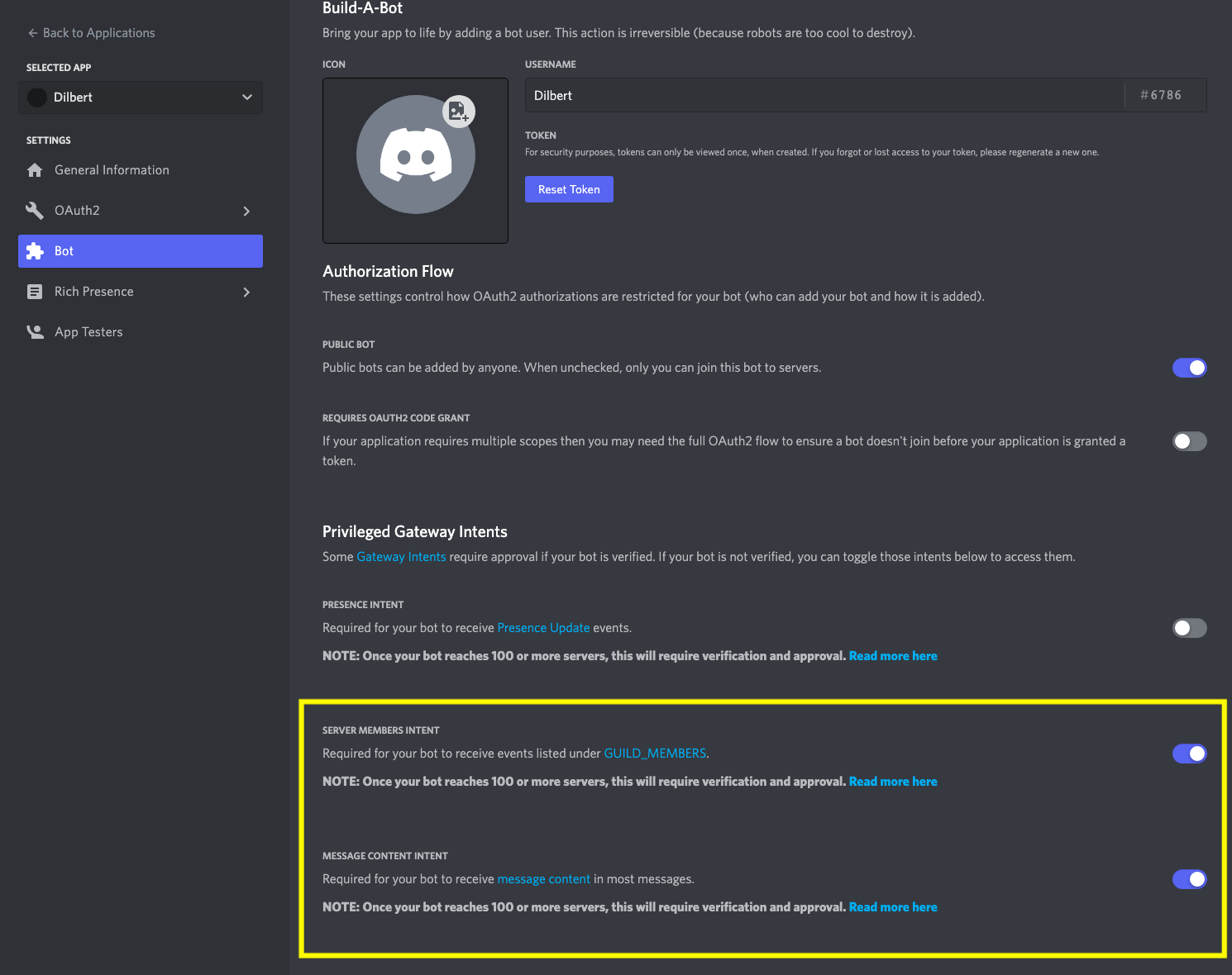 MESSAGE CONTENT INTENT&SERVER MEMBERS INTENTto be enabled