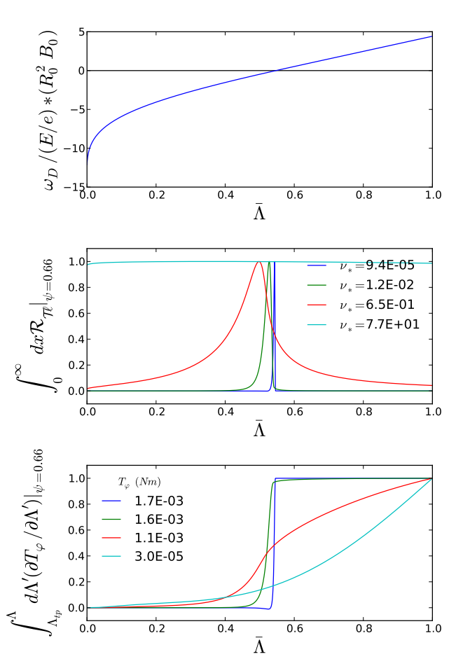 Indeed the These integrations can involve very sharp resonances. I tried analytically estimating where they would be and using a smart-packed grid early on, but it was not accurate / never as good as LSODE. Here are some examples of the energy integrand: Here are some of the pitch: I am 100% open to changing the integrator. I only used LSODE because it was what DCON used and a quick googling (back when I was very new to fortran) confirmed it was still one of the "best" (at least "tried and true") dynamic integrators around. That seemed good for doing lots of integrals that might or might not be very sharp. Do you have something better? [1] N. C. Logan, J.-K. Park, K. Kim, Z. Wang, and J. W. Berkery, “Neoclassical toroidal viscosity in perturbed equilibria with general tokamak geometry,” Phys. Plasmas, vol. 20, no. 12, p. 122507, Dec. 2013. |