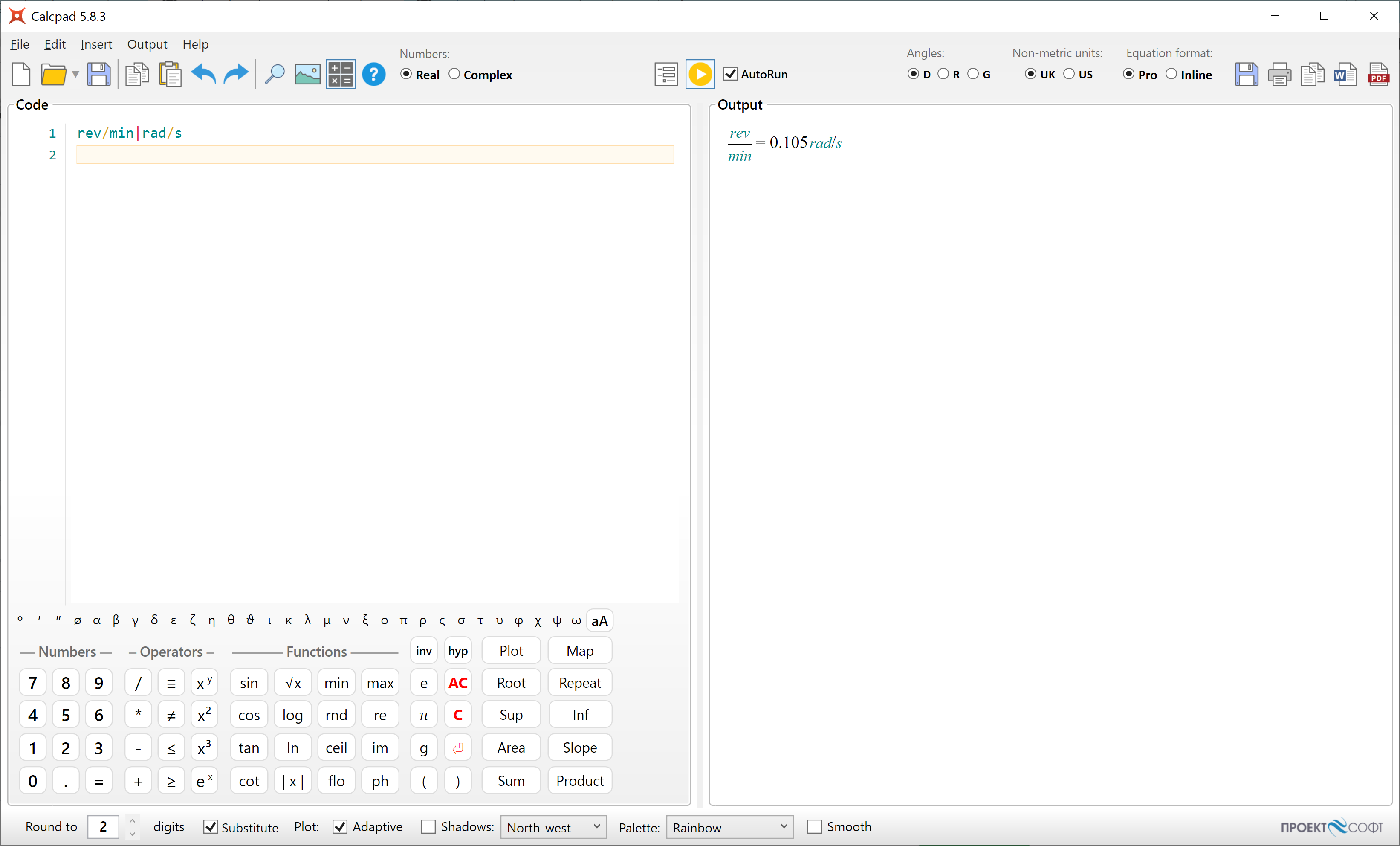 The addition of angle units is much appreciated. It would be great to add "rev" as an angle unit. It would allow to convert rpm "rev/min" to "rad/s" easily for example. |