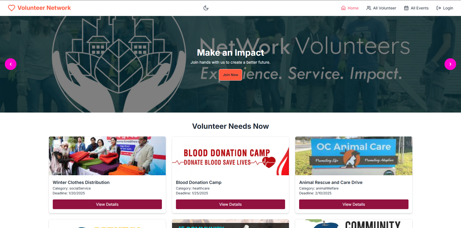A responsive, feature-rich platform to manage and engage with volunteer opportunities. This project demonstrates expertise in creating user-friendly interfaces, secure backends, and robust CRUD functionalities for real-world applications.