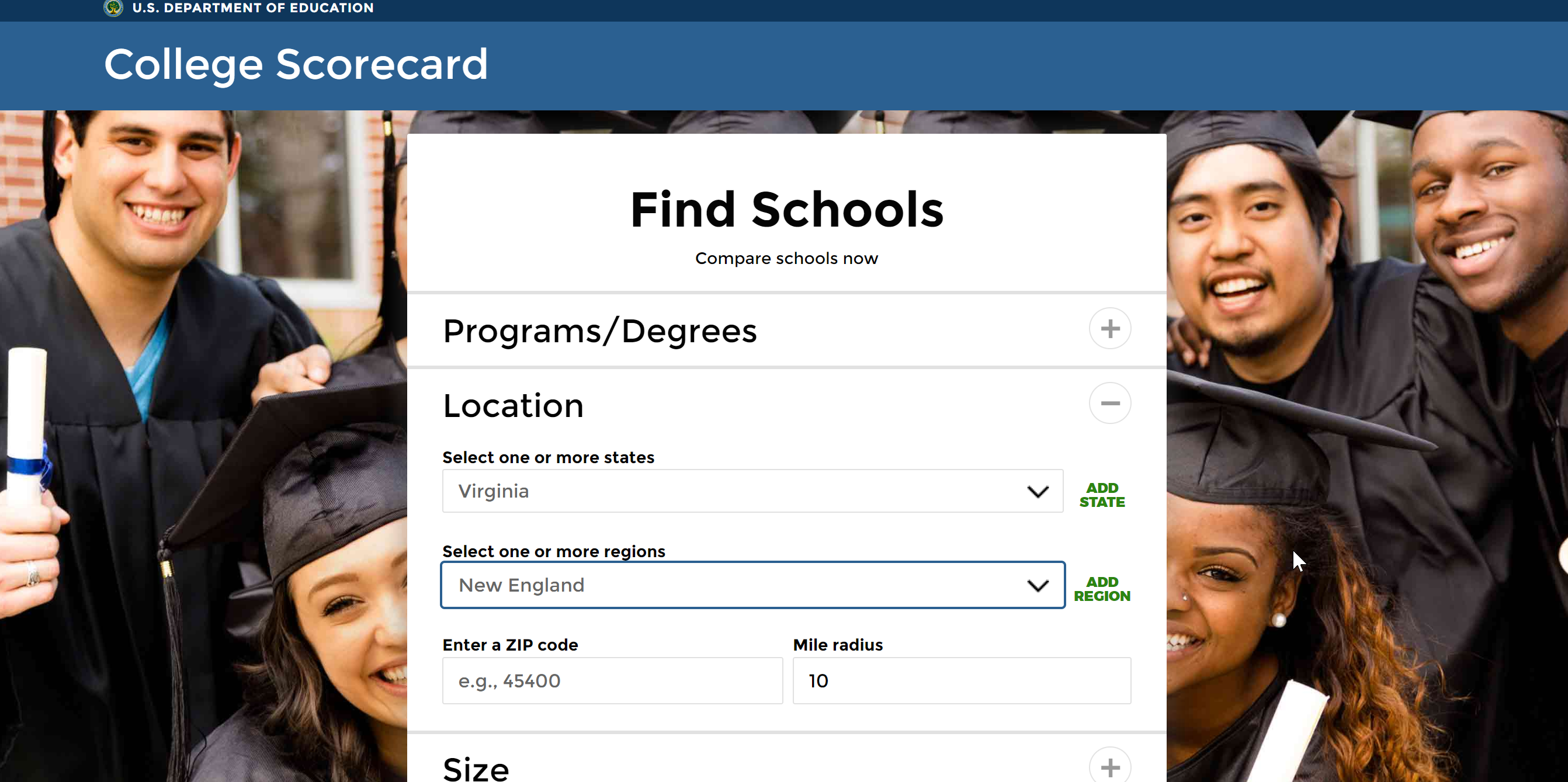 As currently designed, the site lets me think I can search for, say, schools in Virginia in the region of New England. Seems to me if I choose a state, the site should eliminate region as an additional option. (See attached image)