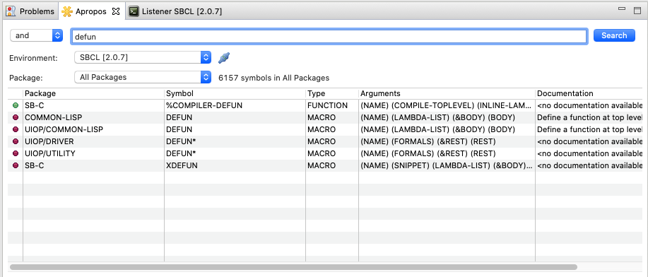 The apropos view allows you to search for functions/macros/packages and their documentation:
