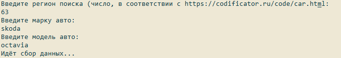 - модель авто (если необходим поиск только по марке, оставьте модель авто пустой); Далее запуститься процесс парсинга:
