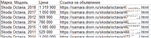 После окончания парсинга сформирется таблица res.csv с результатами: