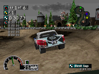 Rally Cross is sort of a hidden gem of a racing game. It is a first party game produced in-house by Sony. In a weird sort of way it can kinda be seen as the precursor to the MotorStorm series. The game features single play, championship mode, time trial, and other modes. Each race consist of you and three other racers for a total of four vehicles. The game features tracks of different locales, mud, snow, asphalt, and sand. Racing on snowy terrain causes the vehicles to slide and skid all over the place, but by accelerating and braking you can still keep control of your vehicle. The damage model is somewhat advanced for its time; all sides of the vehicle can become damaged, even the top. You can intentionally flip your vehicle, and while it's easy for some vehicles to roll over, you can rock your vehicle back on its wheels by using the shoulder buttons. The game features many different vehicles that each have their own attributes for acceleration, top speed, and handling. As you progress through the game you unlock more tracks and vehicles. The game has an awesome hard-rock instrumental soundtrack. It also supports 4-player split-screen. If you're looking for a fun arcadey racing game with some fun physics, give Rally Cross a try!