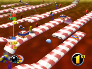With a name like Iggy's Reckin' Balls, you might be expecting a game chock full of punk rock, bad grammar, demolition, and iguana owner culture, but you'd be pretty far off the mark. Reckin' Balls stars the titular Iggy and his friends, various anthropomorphic spheres with long tongues they can use to grapple onto platforms, switches, and even other players. At its heart, this is a racing game. You advance by winning races in circuits, which in turn unlocks new circuits full of new races as well as new characters that you can play as. Two things set the mechanics of this game apart from other racing or karting games, though. The first is that most of the levels have a degree of verticality to them, requiring you to grapple and platform upwards as you make your way up "towers" - think rings of racetracks floating on top of each other. In this way you could consider it a type of "platforming racer". The second is the ability to attack other players with a grapple. Using the grapple, you can grab an opponent in front of you and lift them over your head, slamming them to the ground behind you, momentarily stunning them. You can also grab an opponent and swing them around horizontally, throwing them completely off the tower (is this still considered defenestration, despite the complete lack of window? Not sure...).