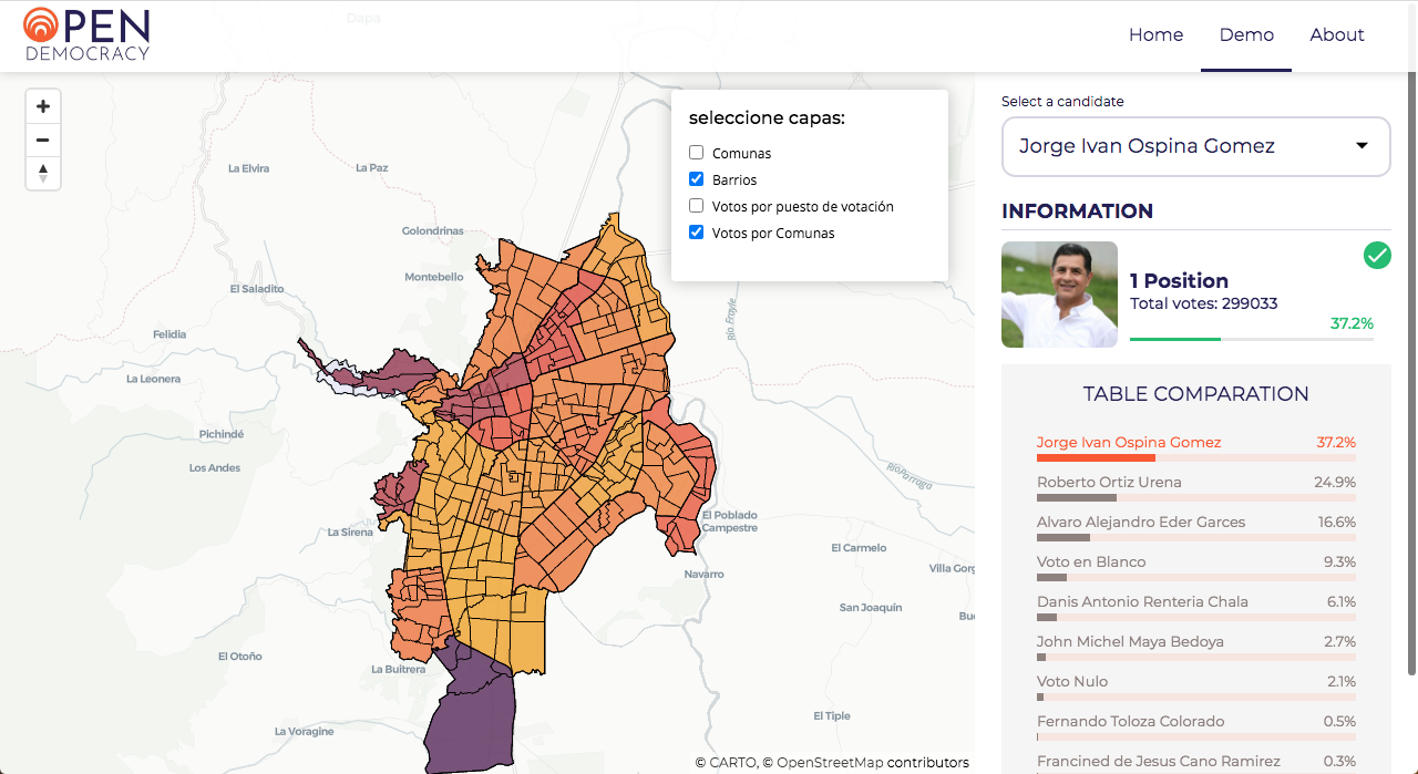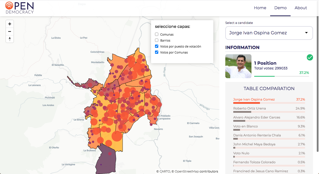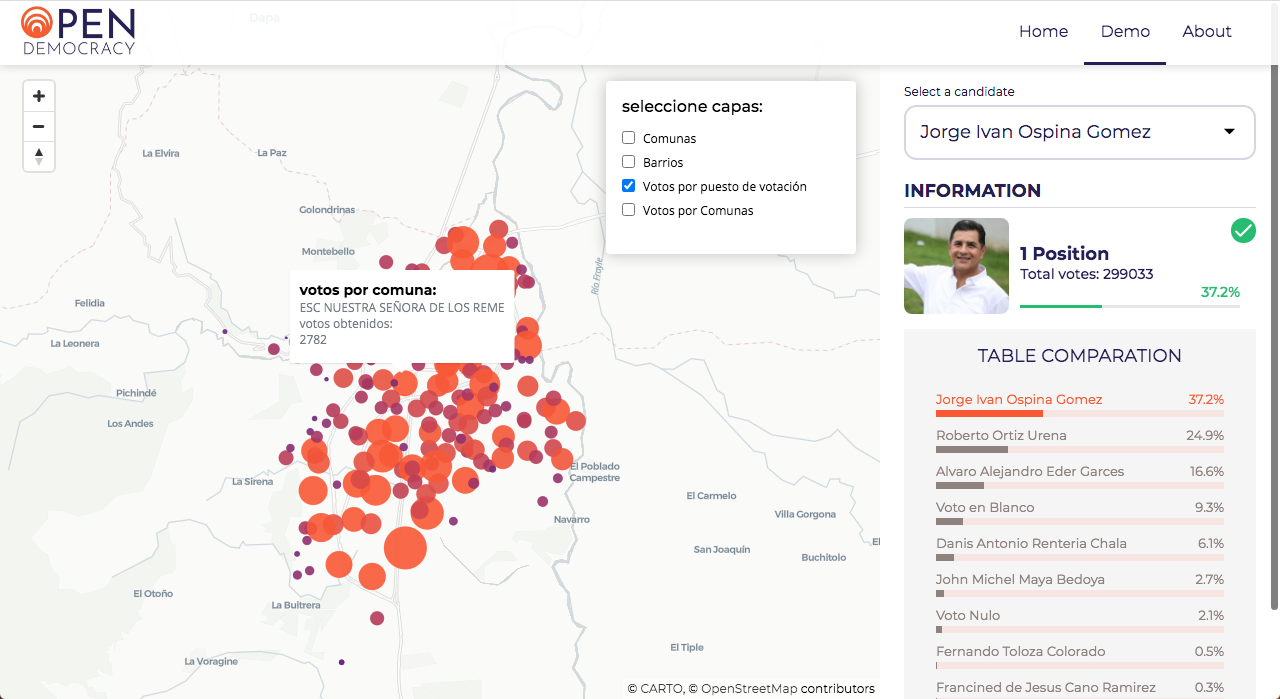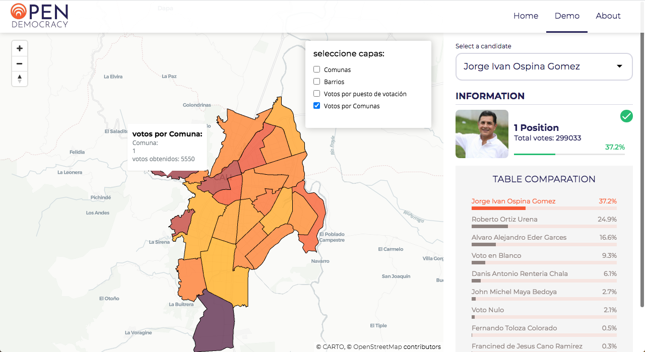 It also consists of its Front-End part in which a visualization of the map of Cali is built and on additional layers, the neighborhoods, communes and the votes of each candidate by voting point are shown.