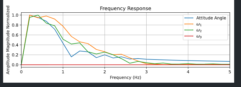 Currently, the flight simulation performs a frequency response analysis for the attitude angle, omega1, omega2 and omega3. This analysis is a simple application of FFT in the first five seconds of derailed flight.