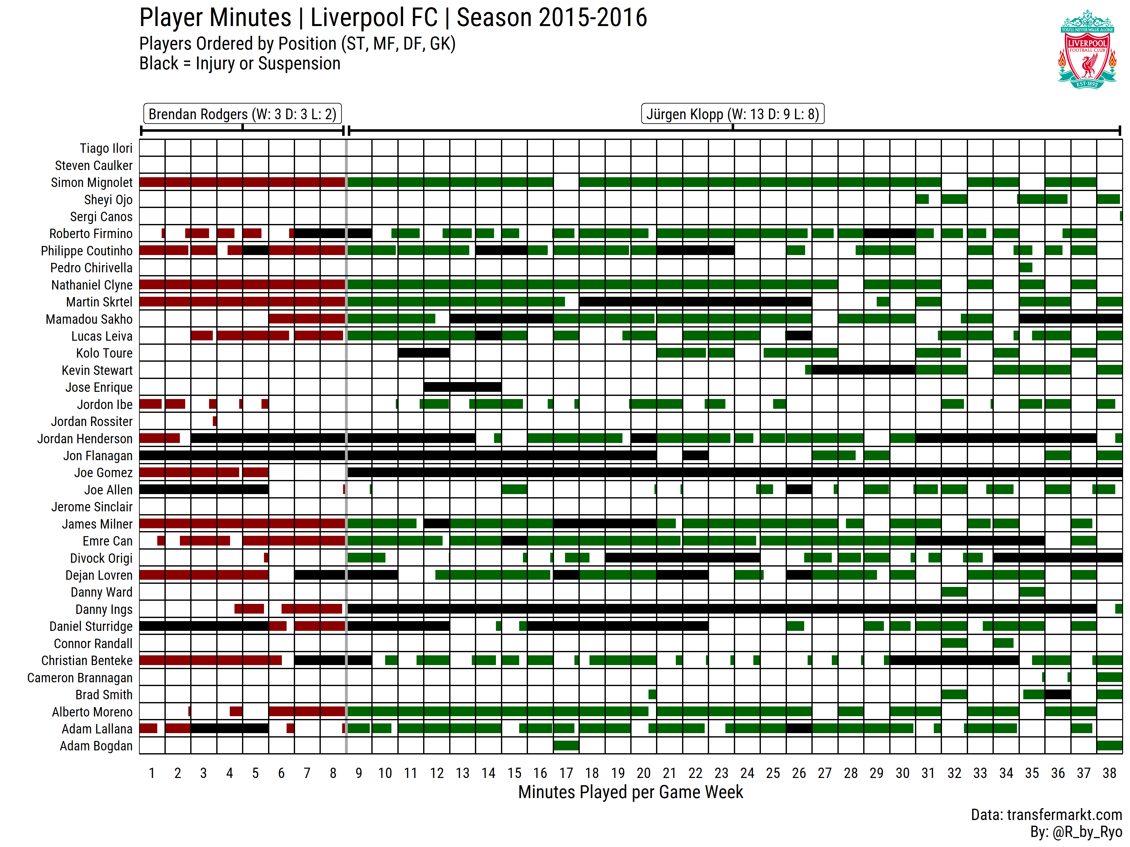 - Player-Minutes Gantt Chart (Liverpool FC: 2010-2011 comparing Roy Hodgson vs. Kenny Dalglish): Gist