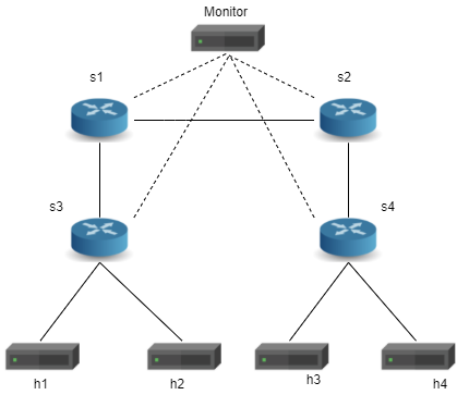 The goal of this task is to use the P4 language to configure the packet processing pipelines for the four switches (S1-S4). In addition to packet forwarding, these switches perform in-network telemetry. More concretely, they detect probe packets with a custom IP header, and add the state of the switch, i.e., swid and queue_size to a duplicated packet that is forwarded to the network monitor.