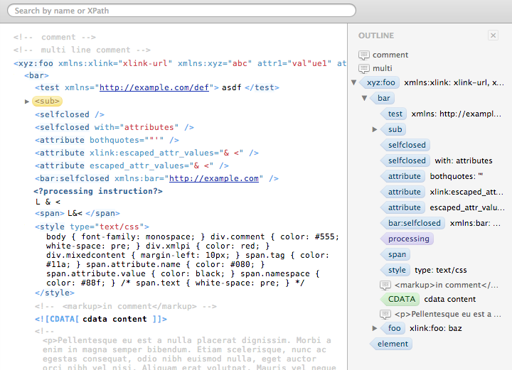 - Quick XPath mode: hold down Command (Mac) or Ctrl (PC) key while moving mouse cursor over element‘s or attribute’s name to enter Quick XPath mode. Use Shift key to cycle through available XPath variants and then drag’n’drop element under cursor into text editor.