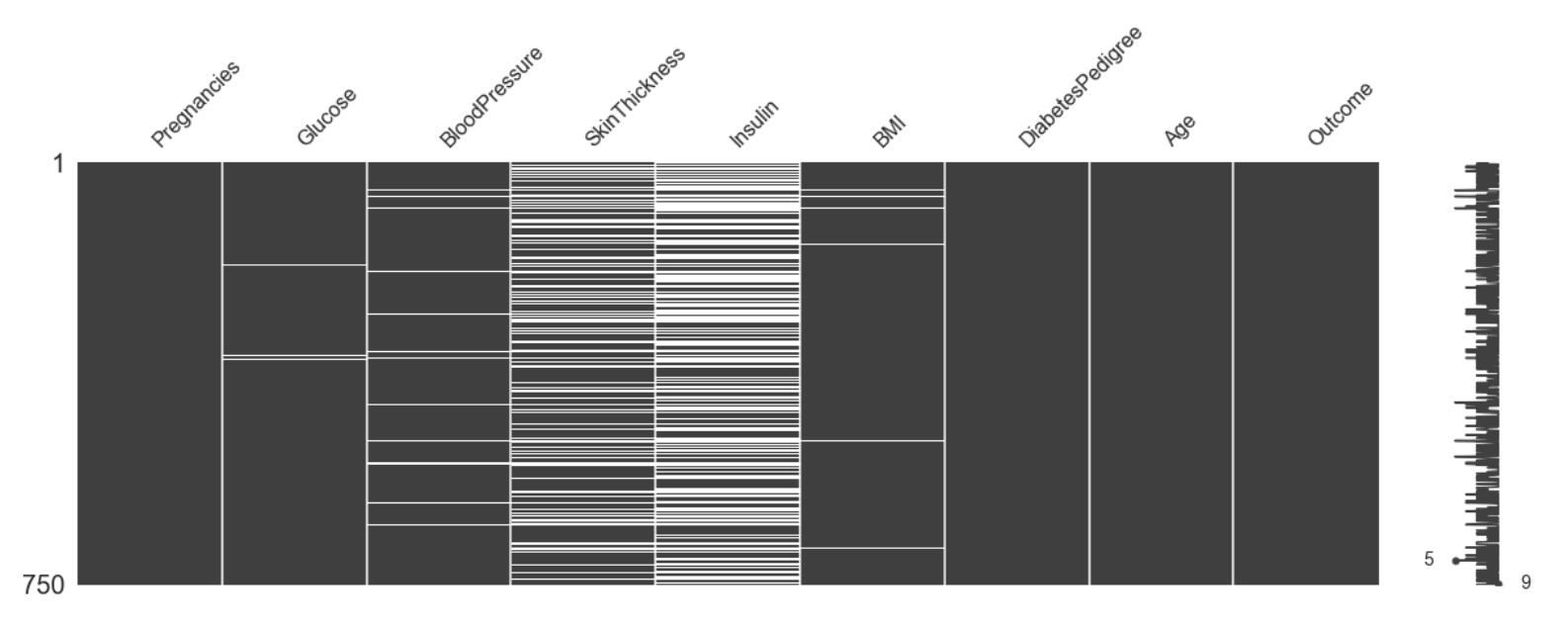 -From the above figure we can visualise that there are many zeros in the column Insulin and Skinthickness. It is not possible to get Insulin and Skinthickness as zero therefore I decided the drop these columns as they will not be useful in the prediction process
