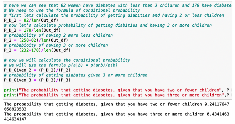 - Predicting if the patient is going to develop diabetes based on three or more children indicator i.e. if the mother has more than three children or not and then calculating the probability of developing diabetes given the mother has more than three children and vice verca