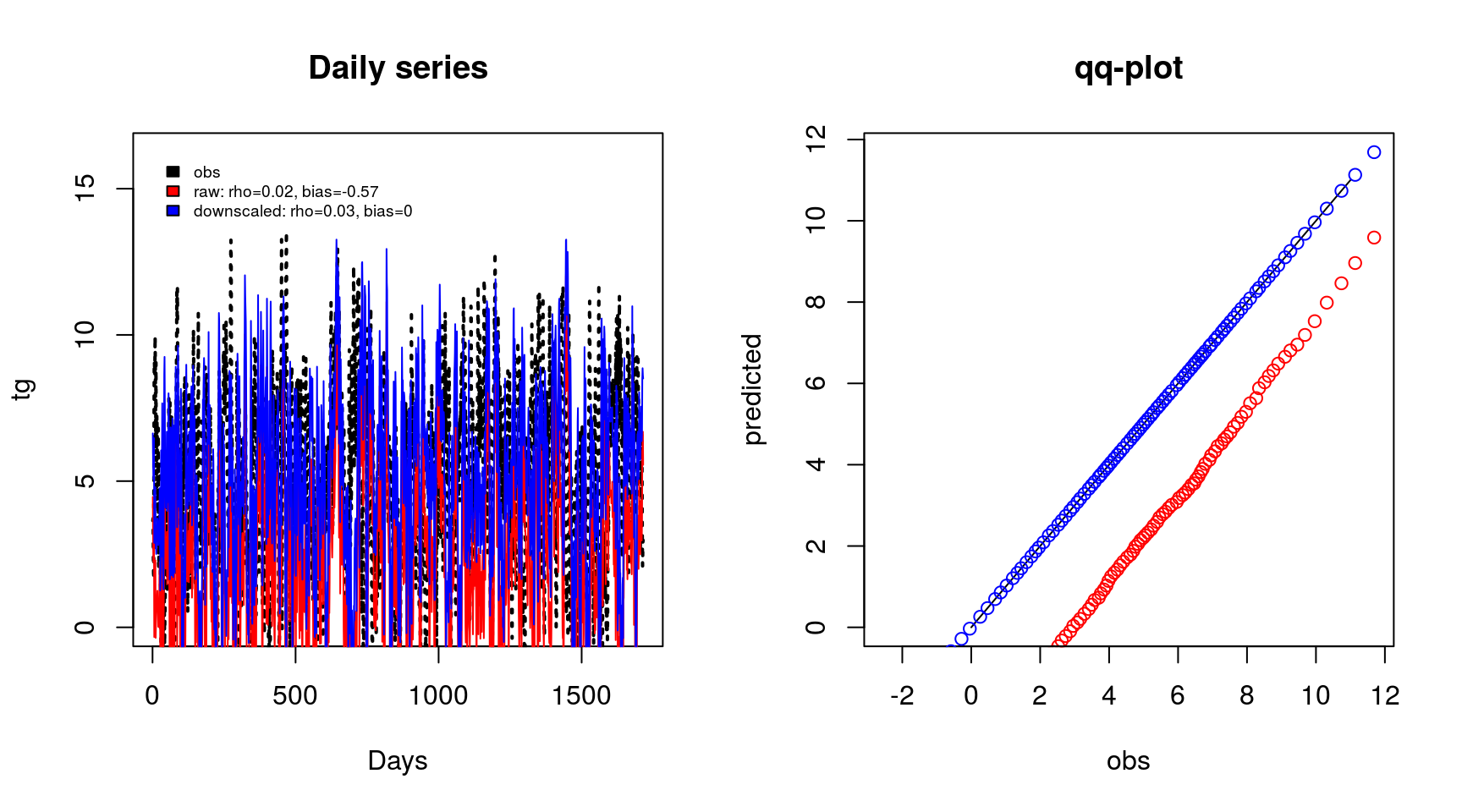 Once we have calibrated the simulation for the test period, we can validate the result against the observational reference. This can be easily done for a selected location with function quickDiagnostics, that returns two graphs. The first shows time-series of the original simulation (red), the calibrated simulation (blue) and the observation (black). The second graph is the quantile-quantile plot, that better illustrates the effect of the applied method.