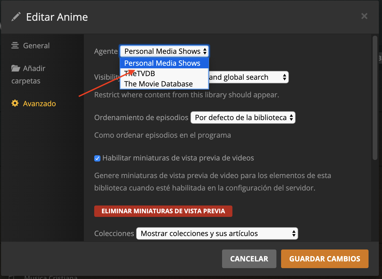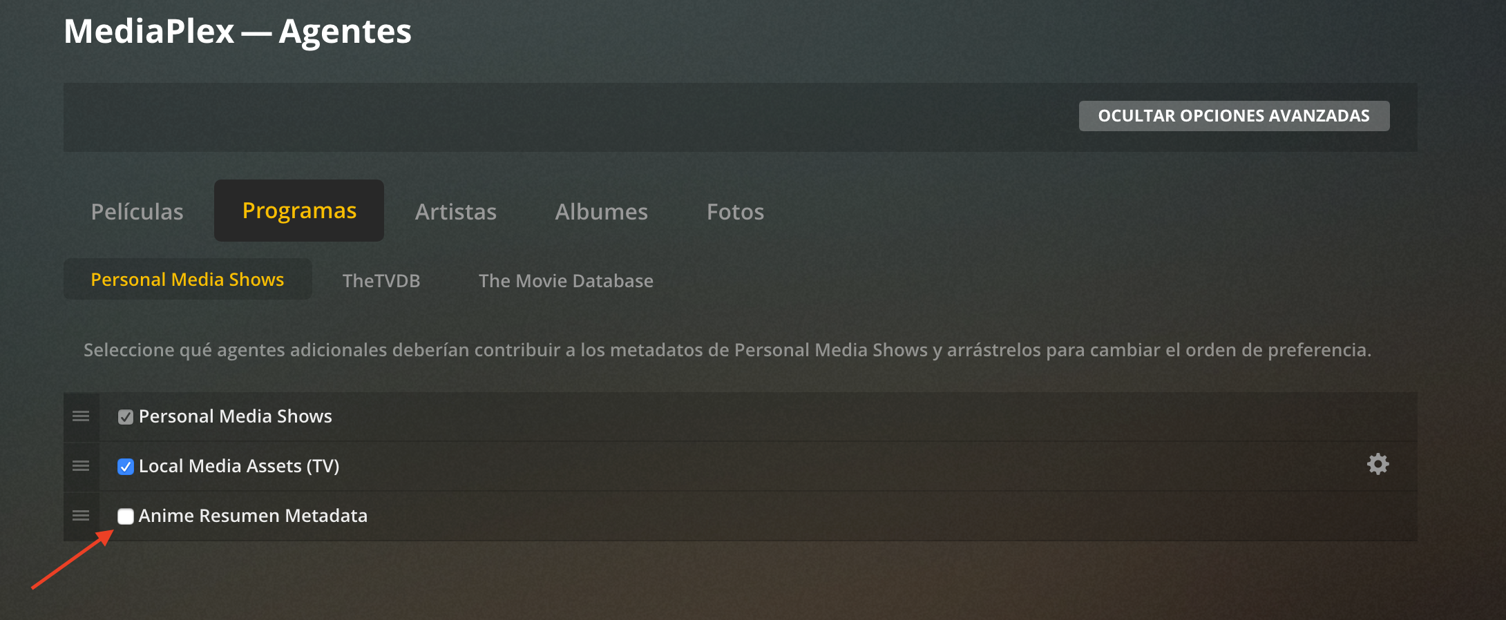 Uso: - Ir a Settings -> Server -> Agents -> Movies/TV Shows (Ajustes --> Agentes --> Programas).