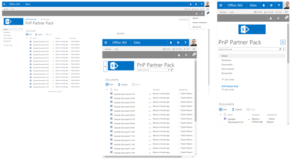 PnP Partner Pack can be considered as Starter Kit for customers and partners and combines numerous patterns and practices demonstrated in the PnP samples to one reusable solution, which can be deployed and used in any Office 365 tenant. PnP Partner Pack is using PnP SharePoint Core Component, which increases developer productivity with CSOM and REST based operations.