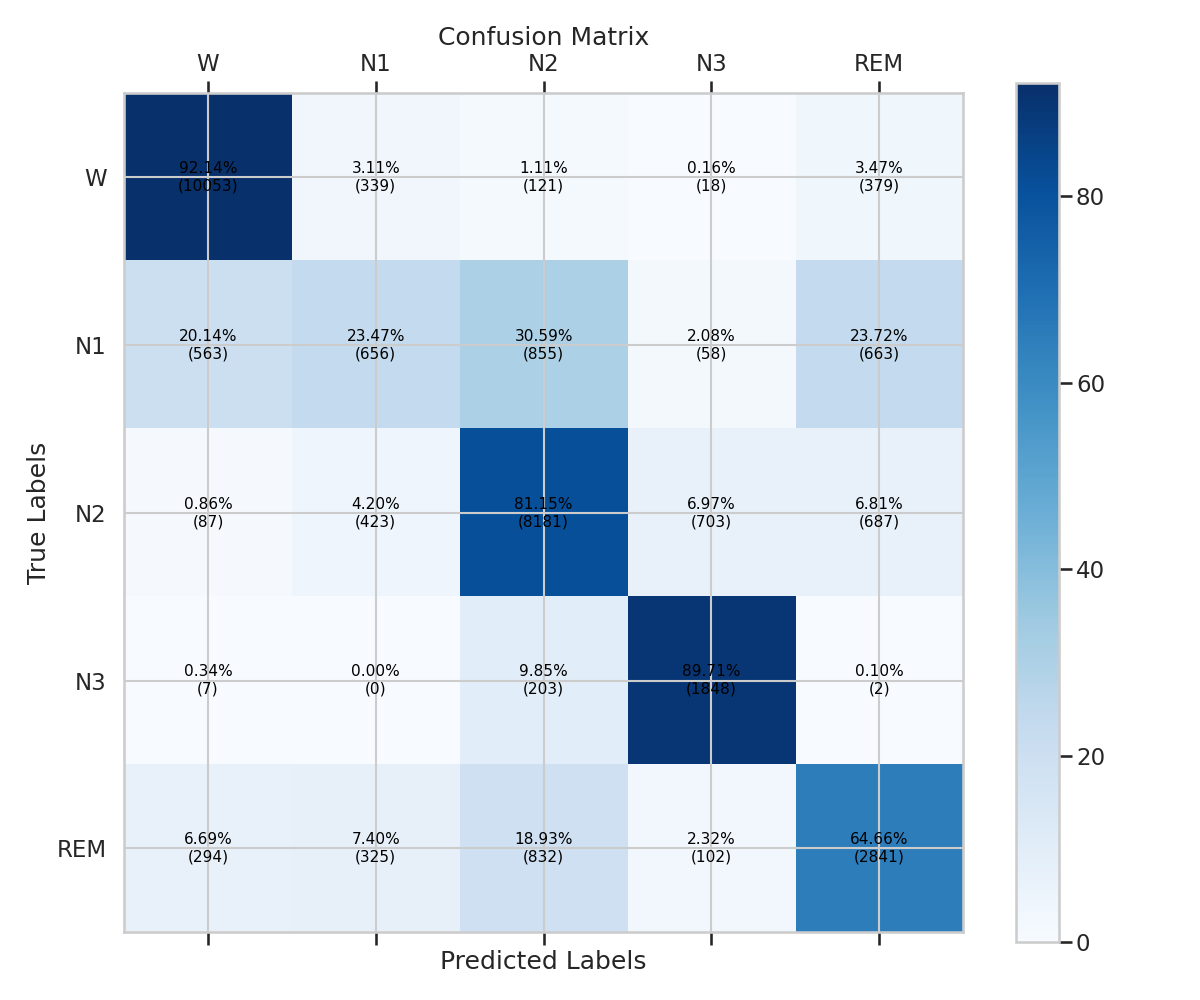 Latent space quality: Our contrastive pretraining produces well-separated clusters that align with sleep stage labels, as evidenced by high Adjusted Rand Index (ARI) scores.