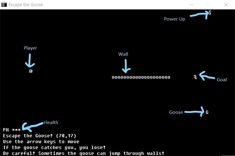 - Apart from the player and goose, there is a safe zone, power-up zone, player health bar and a wall in the game