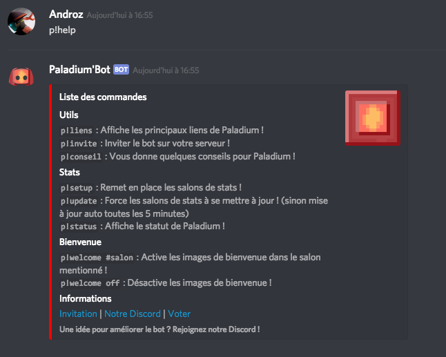 Paladium'Bot vous permet d'afficher des salons avec les statistiques du serveur Minecraft Paladium :