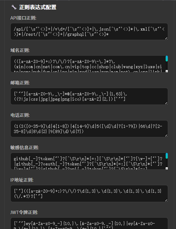 - API / 域名 / 邮箱 / 手机号 / 敏感信息 / IP / 路径 / JWT / Bearer / Basic / Authorization / 微信AppID / AWS / Google API Key / GitHub/GitLab Token / Webhook / 加密调用 / GitHub 链接 / Vue 文件 / 公司名称 / 注释 等