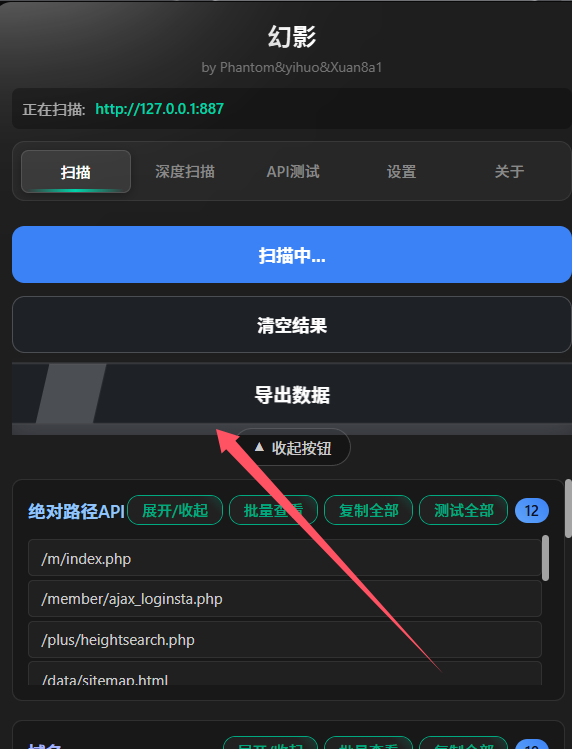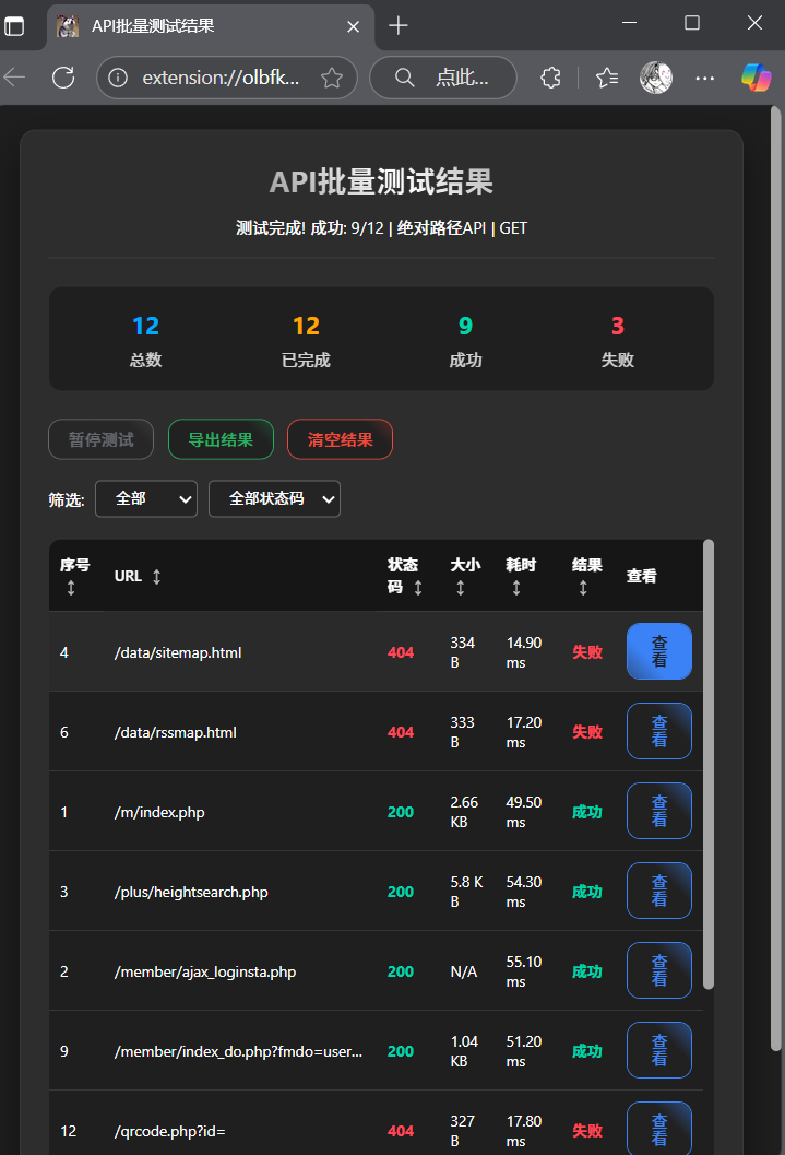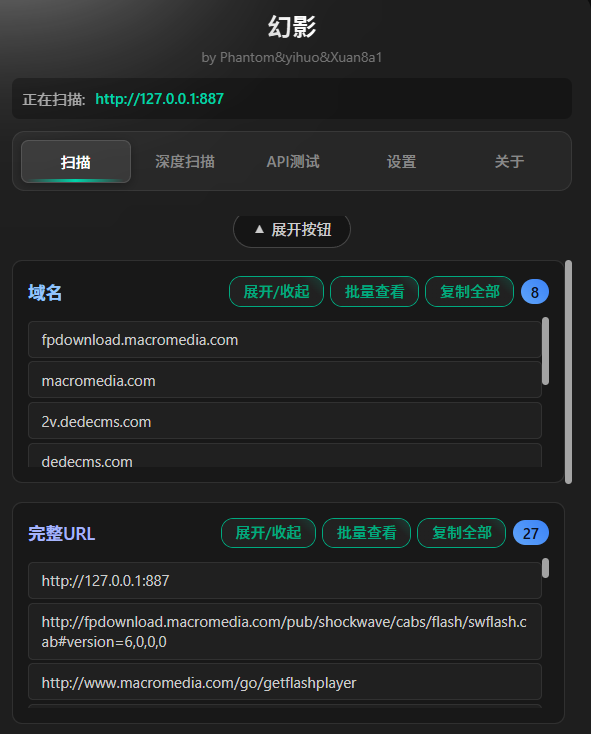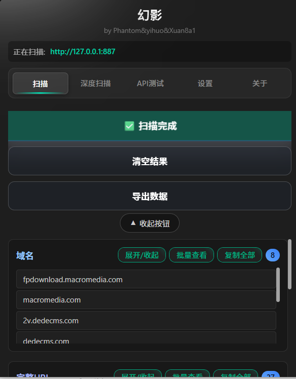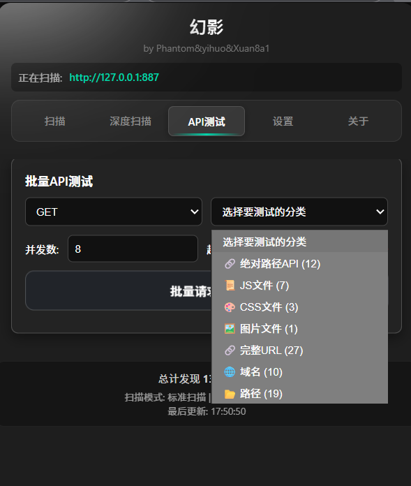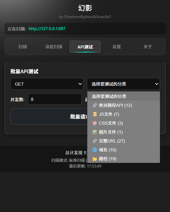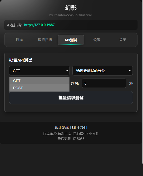 - 批量 API 测试:对扫描到的分类条目进行 GET/POST 批测,并发与超时可配置,结果支持复制