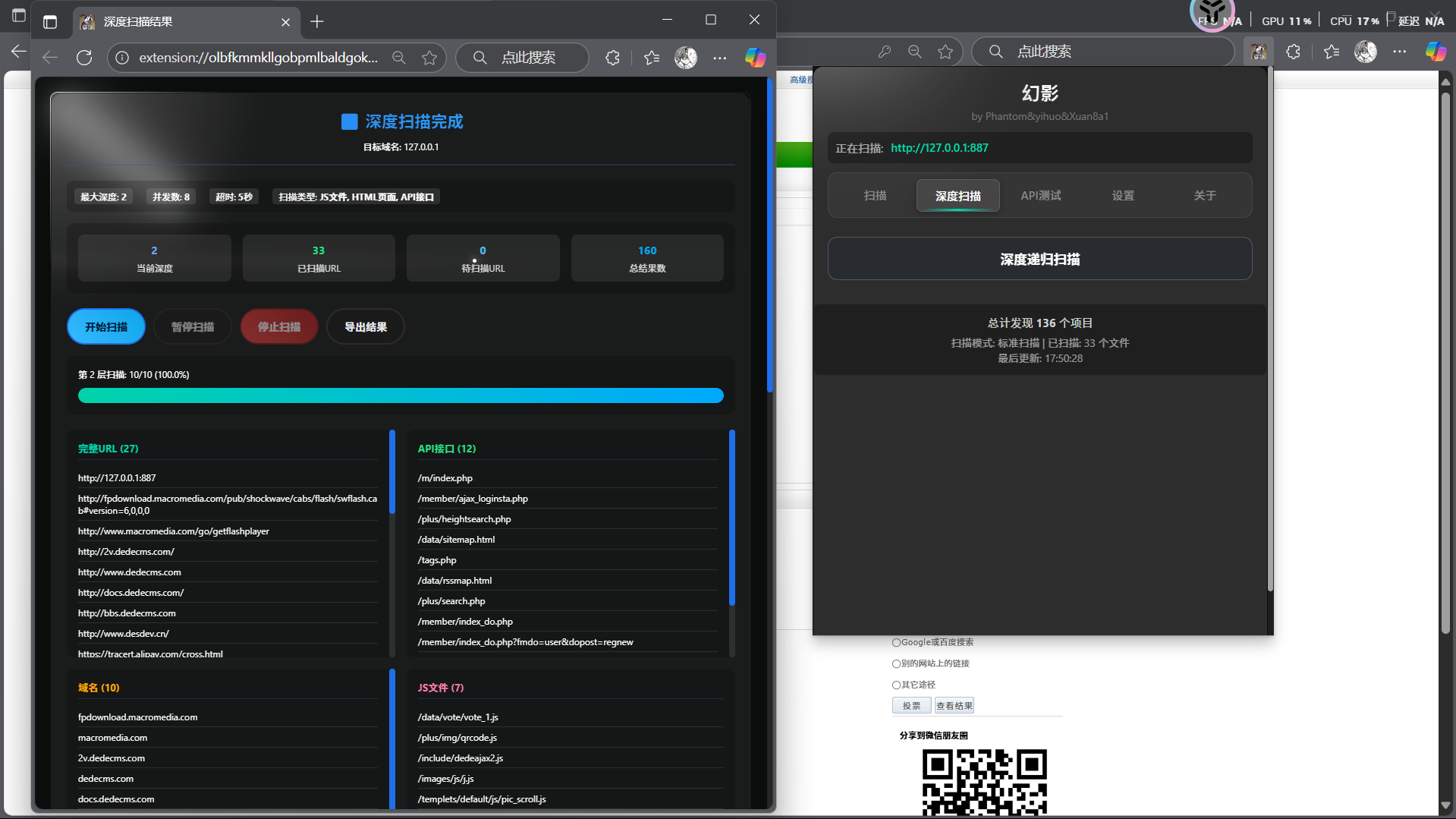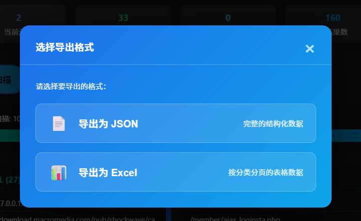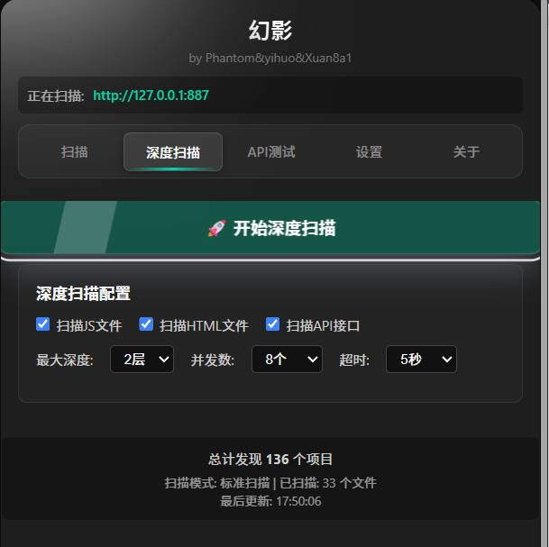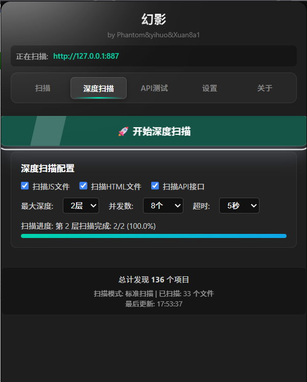 - 深度递归扫描:多层链接/资源爬取,支持并发、超时配置,并在新窗口中运行,不阻塞当前操作